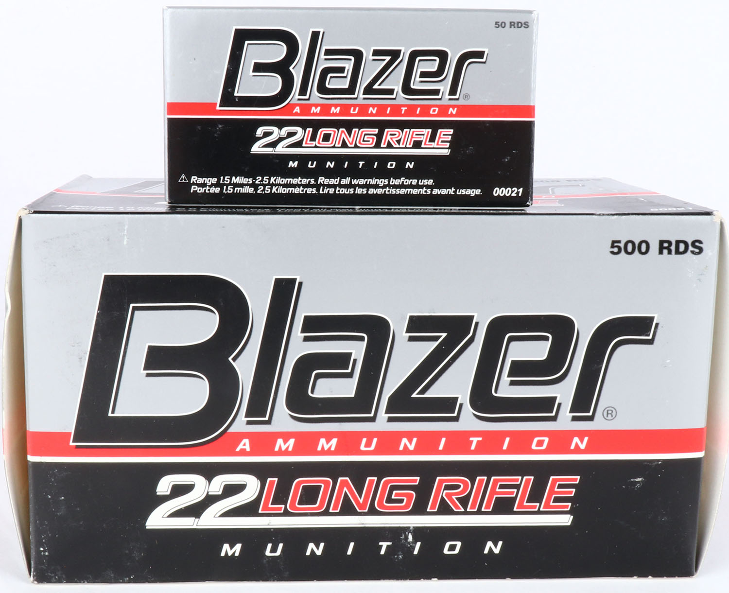 CCi, Blazer, .22 Long Rifle, Full, 500rds., 1pc. Silver black & red brick, brick is solid with excellent to minty color, very minor shelf & corner wear, edges are crisp, end flaps are solid, inside boxes are mint. Grade: Excellent + - Value: 30 to 90