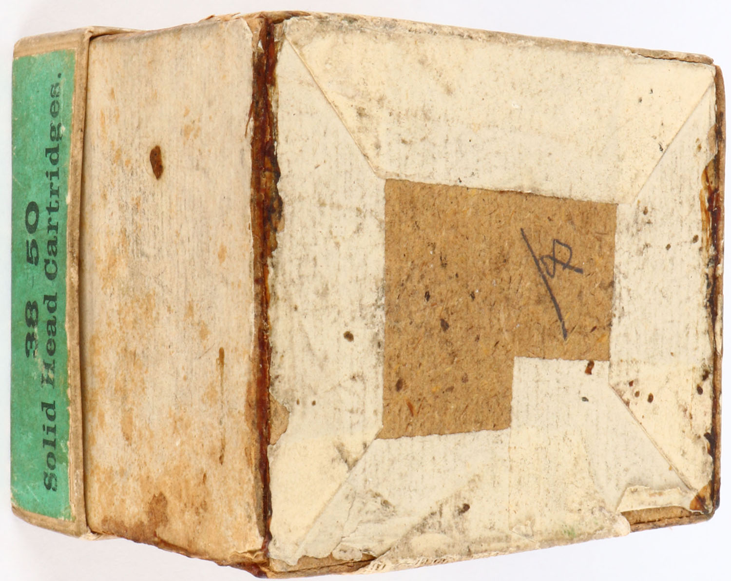 E. Remington & Sons, Metallic Cartridges, .38-50, Solid Head Cartridges, Partial, 2rds. 2pc. Buff box with green top label, box is solid with very good color, some age soiling, staining to bottom, minor shelf wear, some edge & corner wear, ammo is excellent. Grade: Very Good + - Value: 10 to 50