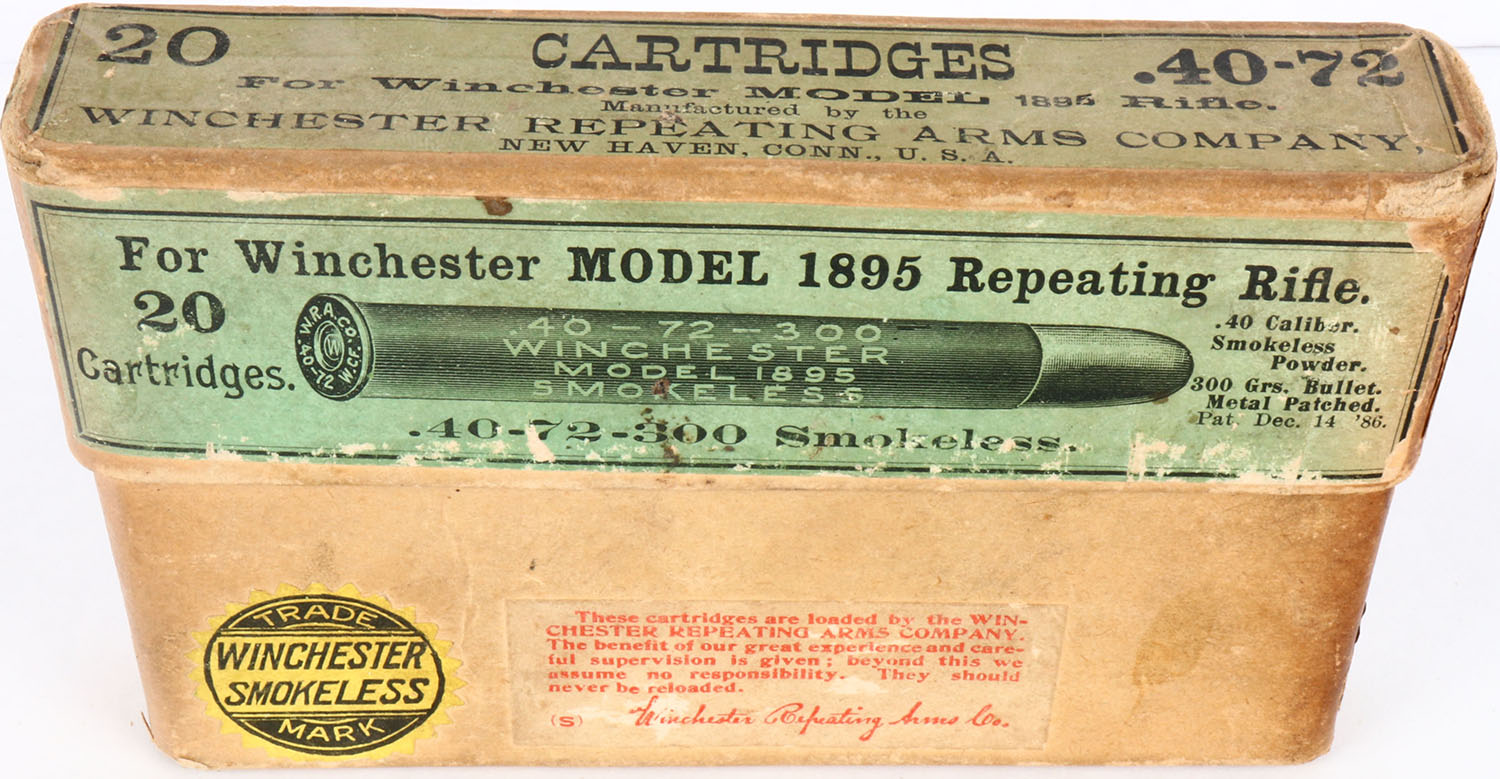 Winchester, .40-72-300, Smokeless, Partial 16rds. Correct, 2pc. Buff box with green labels, box is solid with very good color, some age soiling & color fading, minor shelf wear, some edge wear, labels are intact, ammo is excellent. Grade: Excellent - Value: 50 to 150