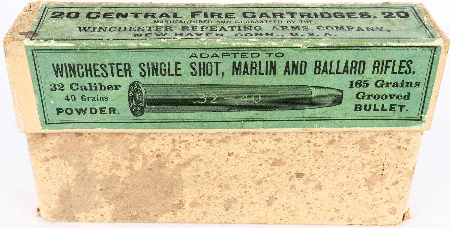 Winchester, Central Fire Cartridges, .32-40, 165 Grains Grooved Bullet, Full, 2pc. Buff box with green label, box is solid with excellent color, very minor age soiling, staining, minor edge & corner wear, label is intact, ammo is excellent. Grade: Excellent - Value: 50 to 150