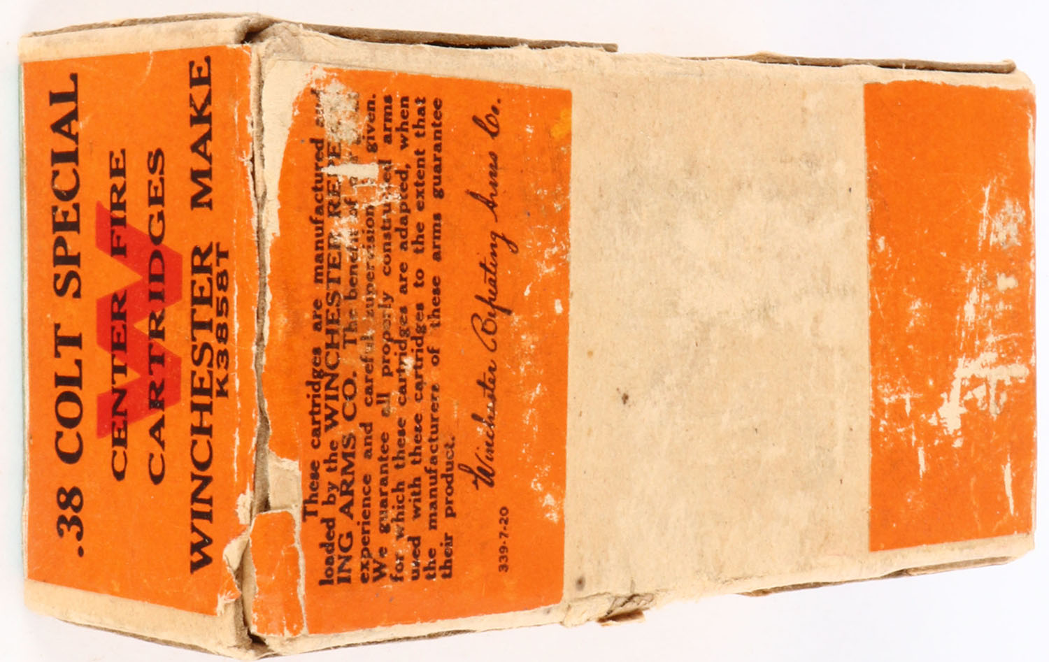 Winchester, .38 Colt Special, 158 Grain Lead Bullets, Partial 45rds., 2pc. Buff box with green & orange wraparound label, box is solid with excellent color, minor shelf wear on bottom, minor edge & corner wear, label is intact, ammo is very good to excellent. Grade: Excellent + - Value: 10 to 50