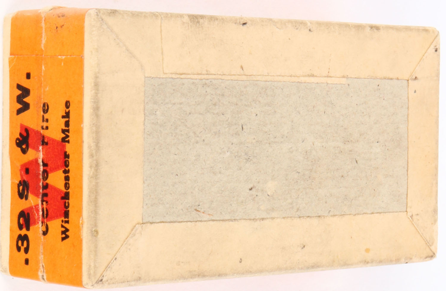 Winchester, .32 Smith & Wesson, Solid Head, Full, 2pc. Buff box with green top & orange side sealing labels, box is solid with minty color, corners are sharp, edges are crisp, labels are intact, ammo is good to very good. Grade: Excellent ++ - Value: 30 to 90