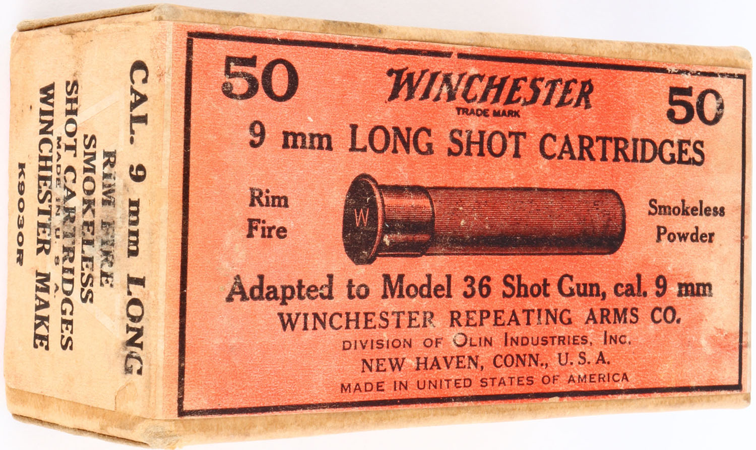 Winchester, 9mm Long Shot Cartridges, Rim Fire, Full, 2pc. Buff box with red wraparound label, box is solid with good color, color fading, minor shelf wear, very minor corner wear, edges are mostly crisp, label is intact, ammo is excellent. Grade: Excellent - Value: 20 to 80