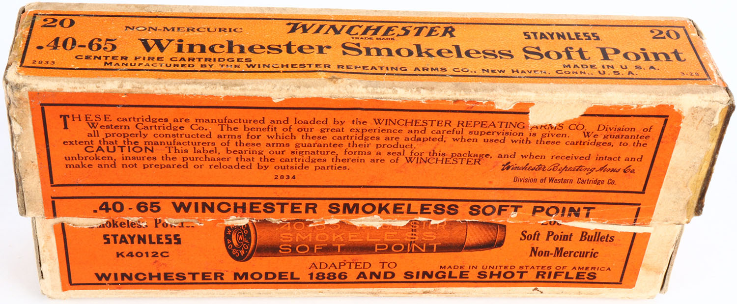 Winchester, Non-Mercuric Staynless, 40-65, 260 Grain Soft Point Bullets, Full, 2pc. Buff box with orange labels, box is solid with excellent color, some edge & corner wear, minor chipping to front label, vertical seam splits on right end of box have been repaired, labels are intact, ammo is excellent. Grade: Excellent - Value: 50 to 150