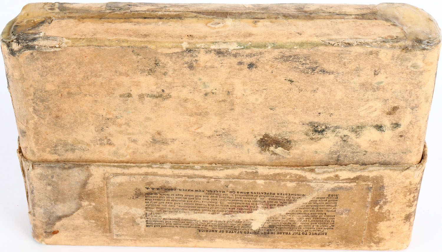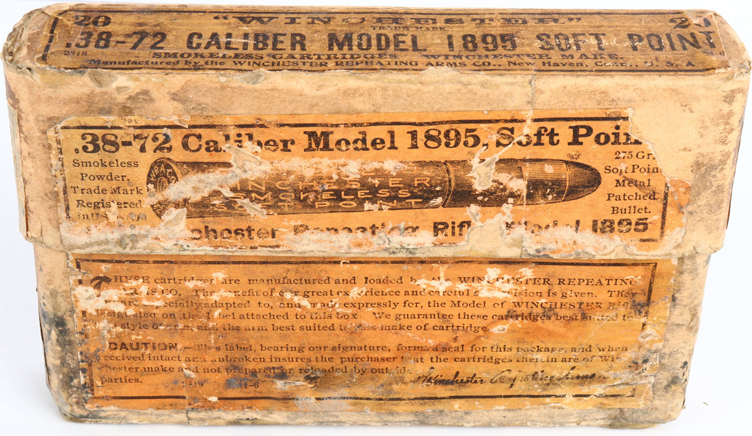 Winchester, Smokeless Cartridges, .38-72, 275 Gr. Soft Point Metal Patched Bullets, Full, 2pc. Buff box with orange labels, box is solid with good color, age soiling, heavy shelf wear, some edge & corner wear, labels are 99% intact. Grade: Very Good - Value: 50 to 200