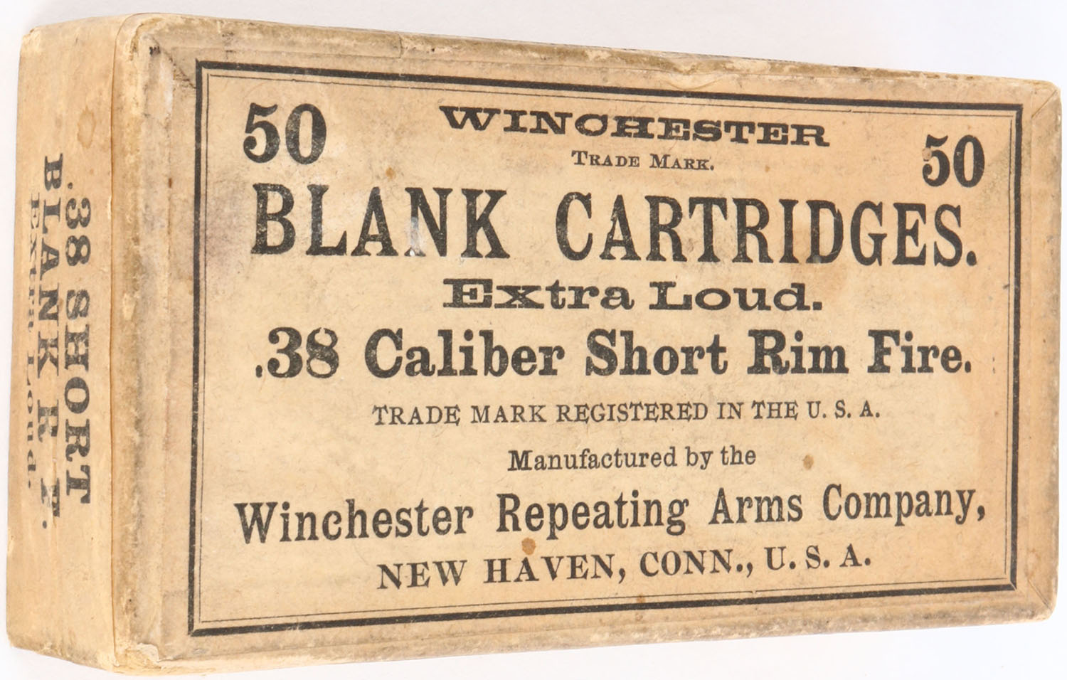 Winchester, .38 Short, Extra Loud Blank Cartridges, FULL & SEALED, 2pc. Buff box with buff top & side sealing labels, box is solid with very good to excellent color, some age soiling & corner wear, very minor edge wear, labels are intact. Grade: Excellent + - Value: 10 to 50