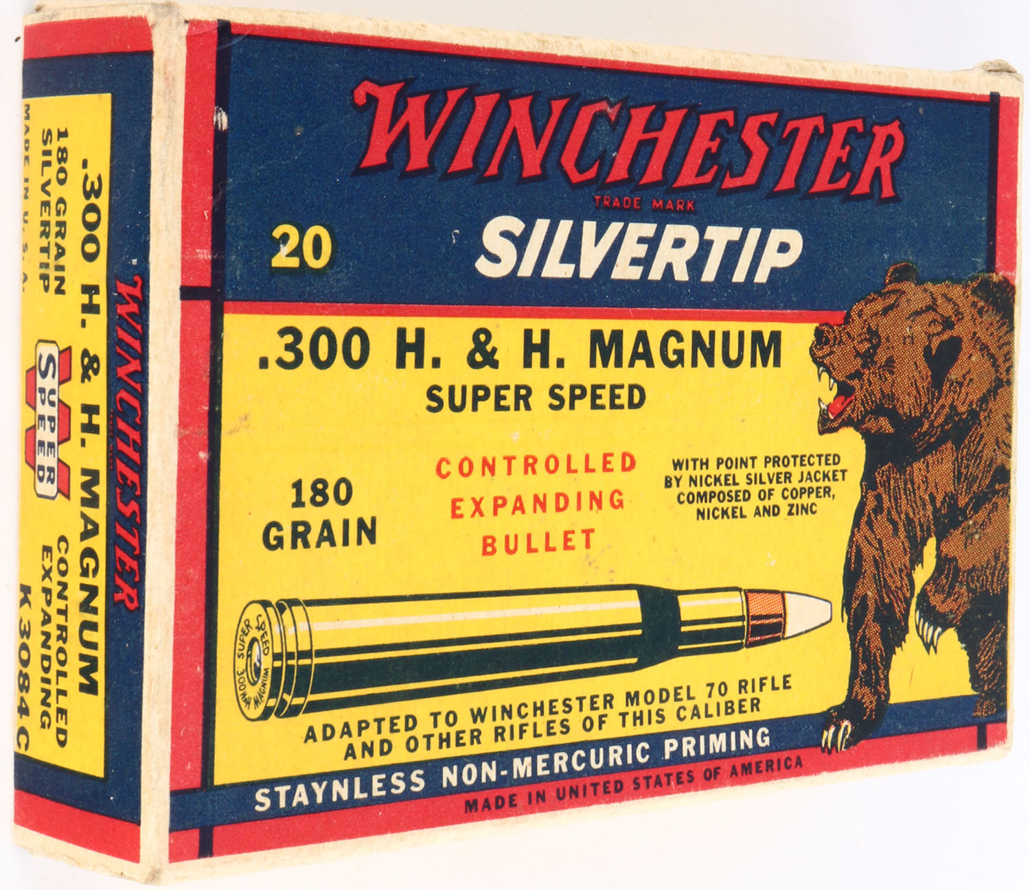 Winchester, Silvertip, .300 H&H Magnum, 180 Grain Controlled Expanding Bullet, Full, 1pc. Yellow blue & red bear box, box is solid with excellent color, very minor shelf wear on bottom, very minor edge & corner wear, end flaps are solid, ammo is excellent. Grade: Excellent + - Value: 200 to 400
