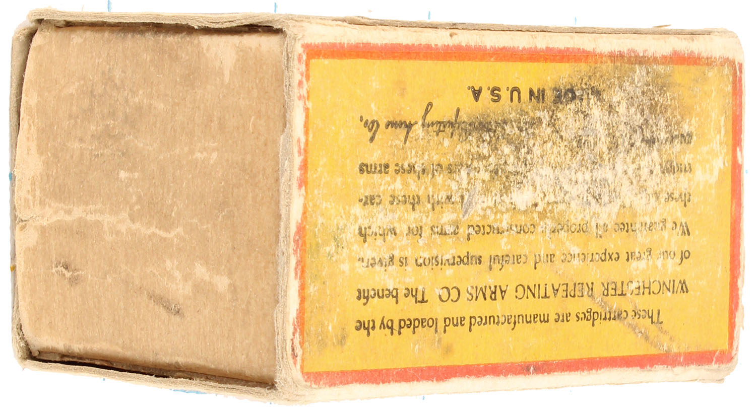 Winchester, Super Speed, .22 Hornet, Non-Mercuric Staynless, 46 Grain Full Patch, Full, 1pc. Yellow red & blue box, box is missing both end flaps, good to very good color, age soiling, some color fading & shelf wear, edge & corner wear, ammo is excellent. Grade: Good ++ - Value: 30 to 400