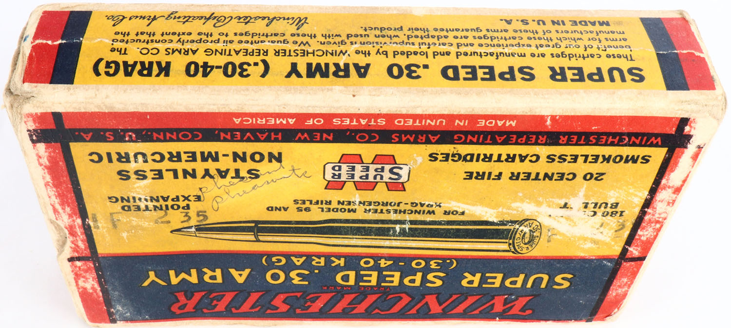 Winchester, Super Speed, .30 Army (.30-40 Krag), 180 Grain Pointed Expanding, Partial 10rds., 1pc. Yellow blue & red box, box is solid with very good to excellent color, minor age soiling, shelf wear, edge & corner wear, end flaps are solid, ammo is excellent. Grade: Very Good + - Value: 10 to 50