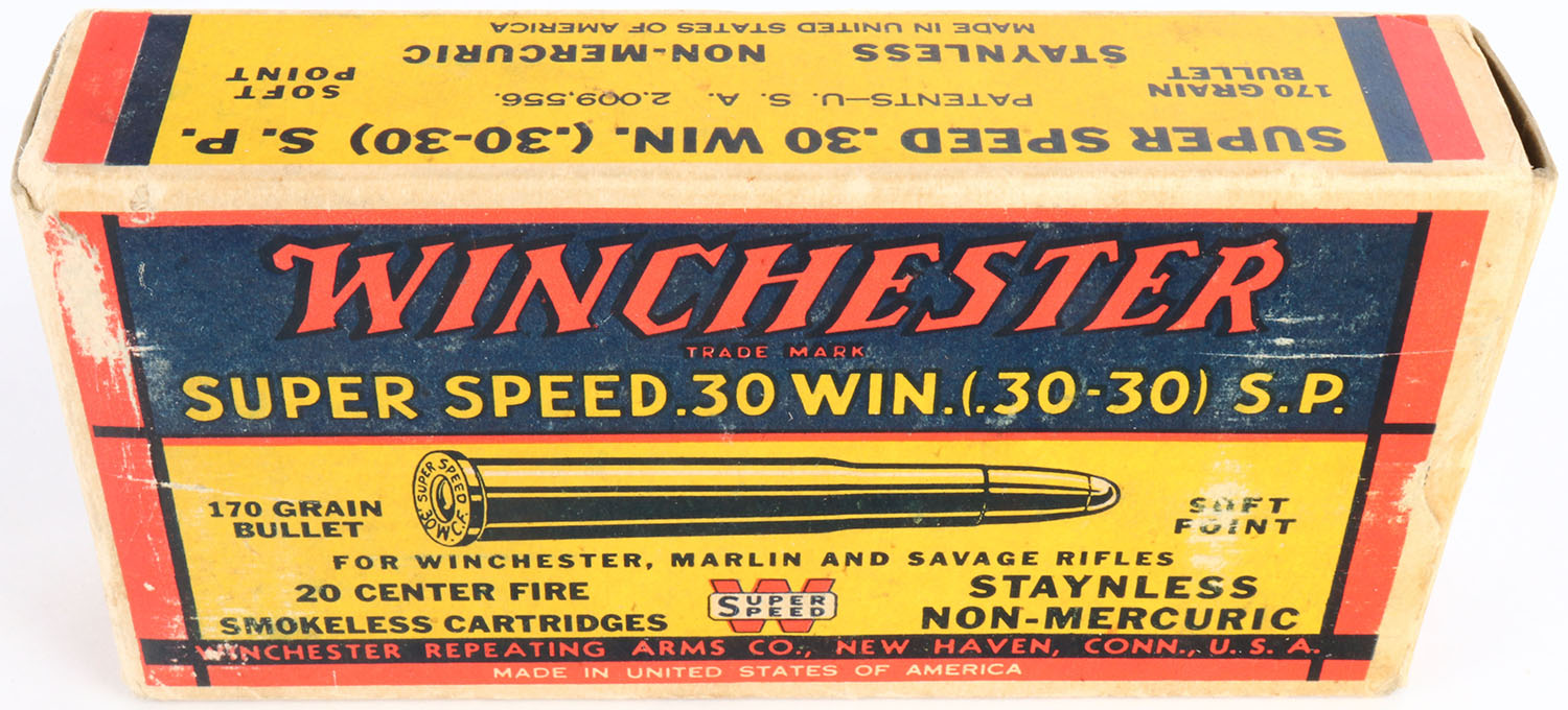 Winchester, Super Speed, .30 Winchester (.30-30), 170 Grain Soft Point Bullet, Partial 16rds. 1pc. Yellow blue & red box, box is solid with excellent color, very minor age soiling & shelf wear, minor corner wear, edges are mostly crisp, end flaps are solid, ammo is excellent. Grade: Excellent - Value: 10 to 50
