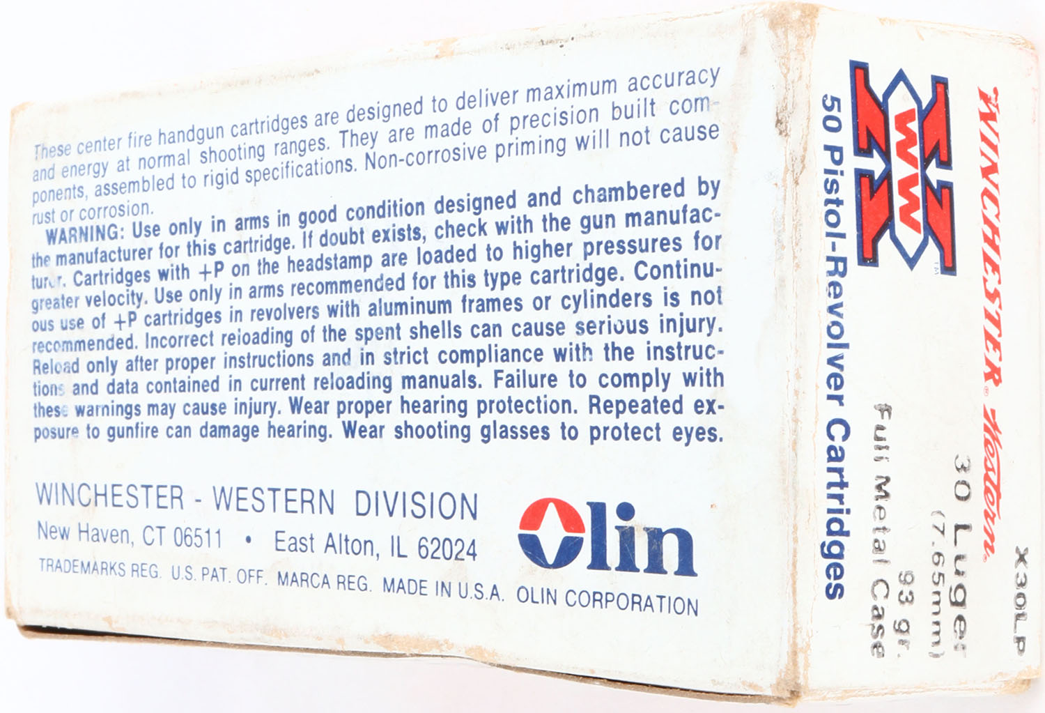 Winchester-Western, .30 Luger (7.65mm), 93 Grain Full Metal Case, Full, 1pc. White box, box is solid with excellent color, minor age soiling & shelf wear, some corner wear, very minor edge wear, end flaps are solid, ammo is excellent. Grade: Excellent - Value: 10 to 40