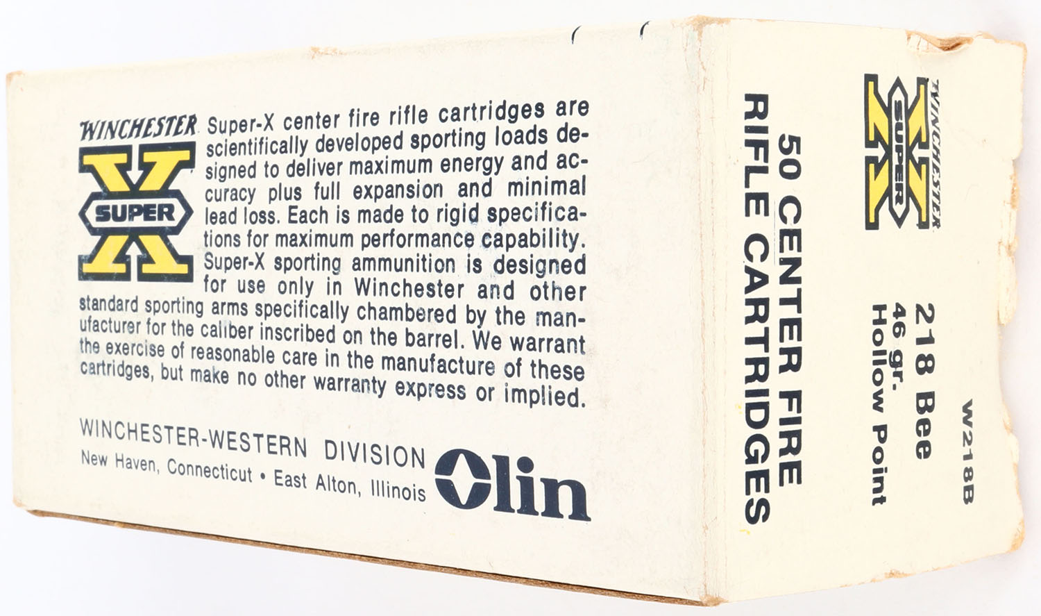 Winchester, Super X, .218 Bee, 46 Grain Hollow Point, Full, 1pc. White box, box is solid with very good to excellent color, minor color fading, shelf wear, some edge & corner wear, end flaps are solid, ammo is excellent. Grade: Very Good ++ - Value: 40 to 120