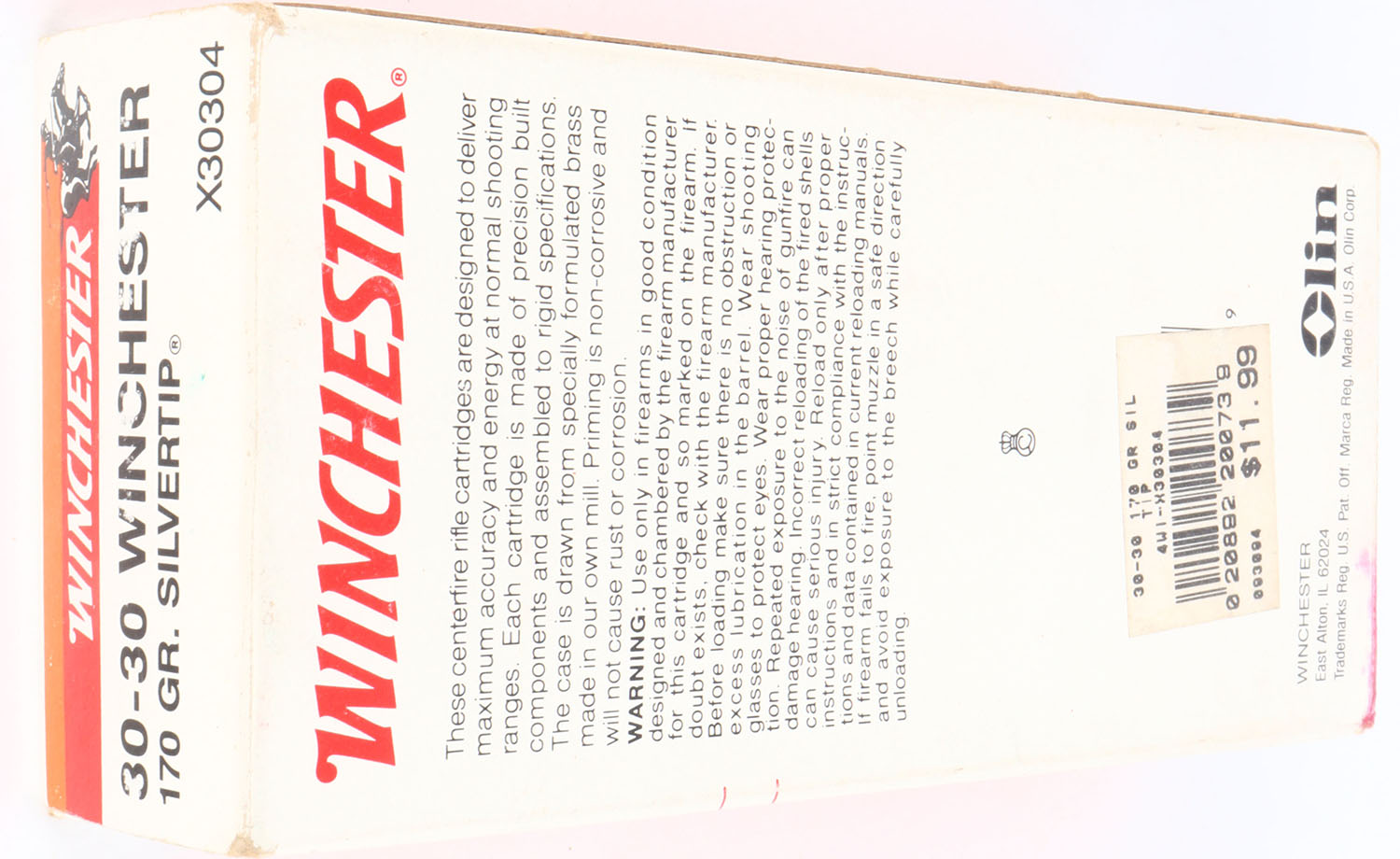 Winchester, Super-X, .30-30 Winchester, 170 Grain Silvertip, Full, 1pc. Gray red & orange box, box is solid with excellent color, very minor age soiling, very minor edge & corner wear, end flaps are solid, ammo is excellent. Grade: Excellent + - Value: 10 to 50