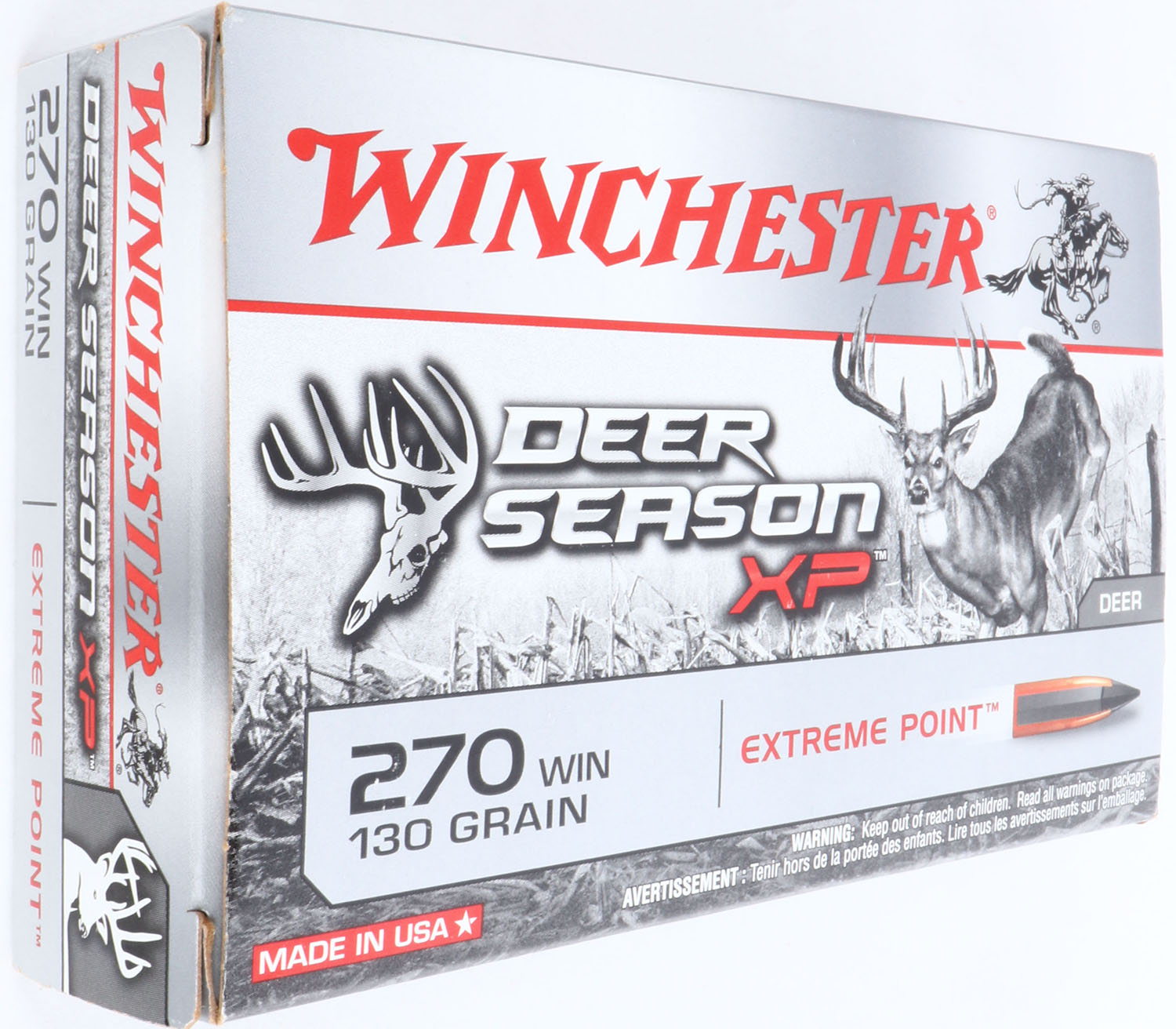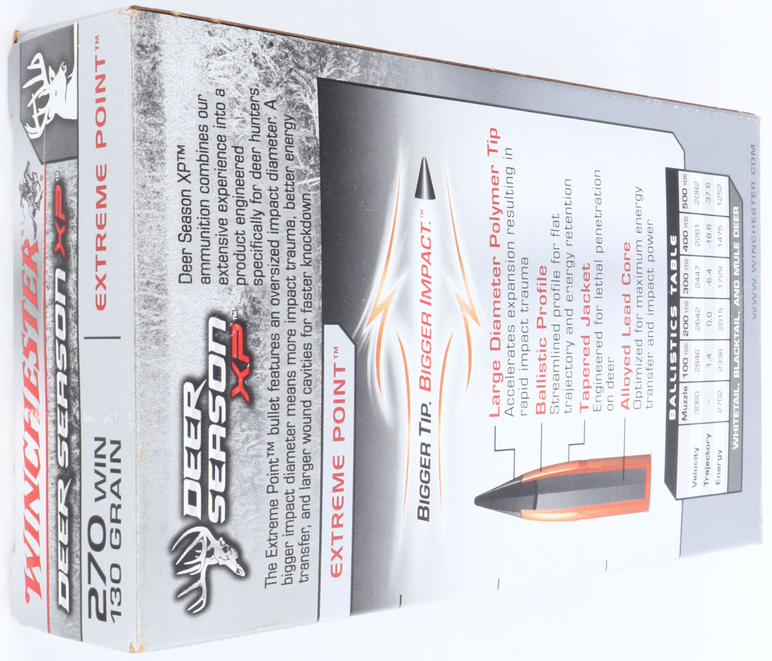 Winchester, Deer Season XP, .270 Winchester, 130 Grain Extreme Point, Full, 1pc. Gray & red box, box is MINT with minty color, corners are sharp, edges are crisp, end flaps are solid, ammo is excellent. Grade: MINT - Value: 10 to 40