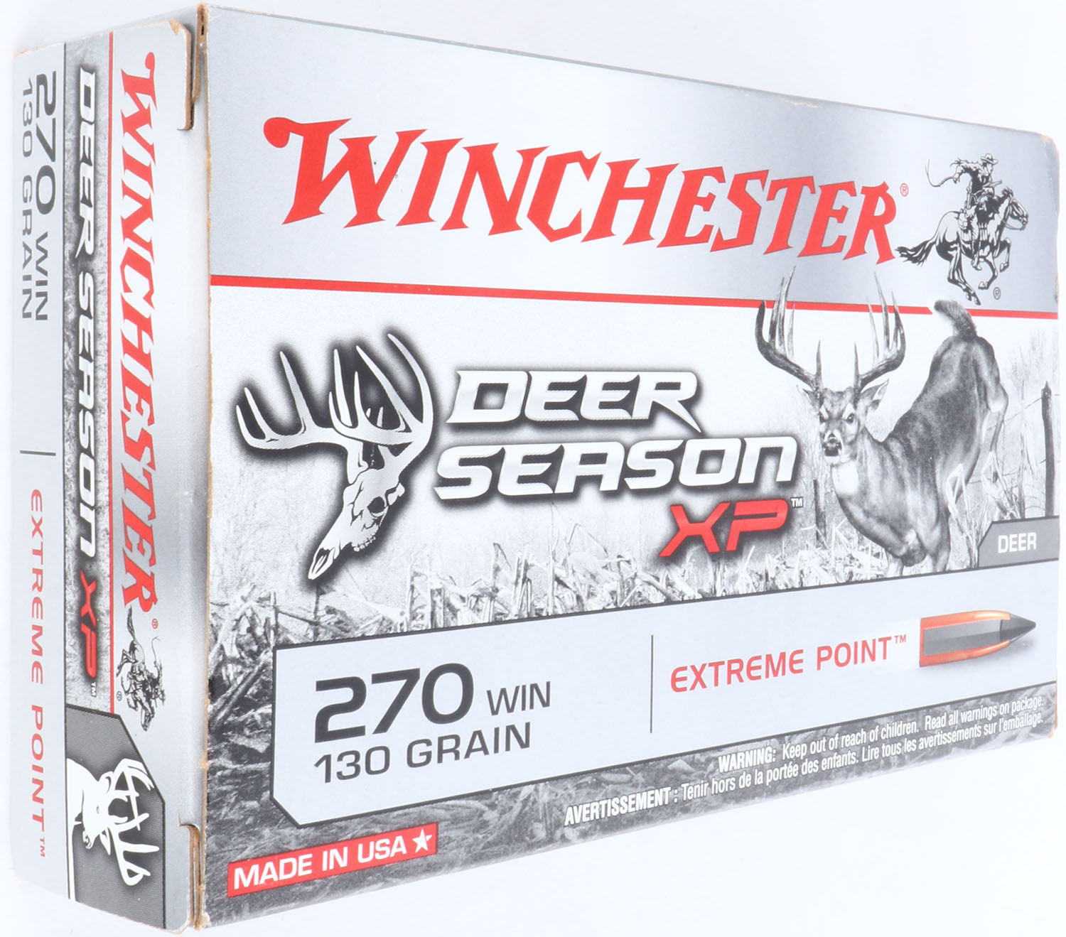Winchester, Deer Season XP, .270 Winchester, 130 Grain Extreme Point, Full, 1pc. Gray & red box, box is MINT with minty color, corners are sharp, edges are crisp, end flaps are solid, ammo is excellent. Grade: MINT - Value: 10 to 40