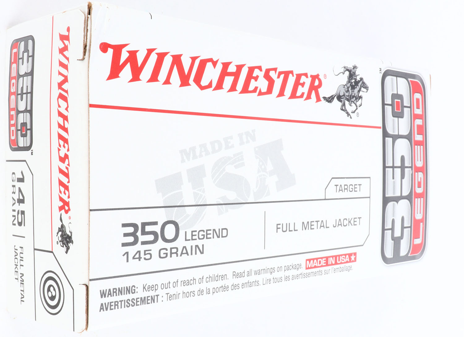 Winchester, Target, .350 Legend, 145 Grain Full Metal Jacket, Full, 1pc. White & red box, box is MINT with mint color, corners are sharp, edges are crisp, end flaps are solid, ammo is excellent. Grade: MINT - Value: 10 to 40