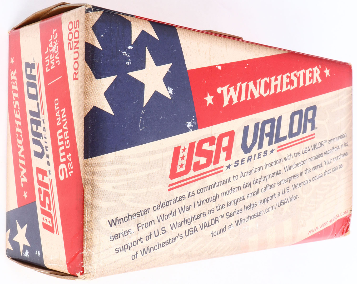 Winchester, USA Valor, 9mm Nato, 124 Grain Full Metal Jacket, FULL & SEALED, 200rds., 1pc. Tan red & blue box, box is near mint with minty color, factory edge has unadhered on left end, corners are sharp, edges are crisp, ammo appears mint. Grade: Excellent + - Value: 30 to 90