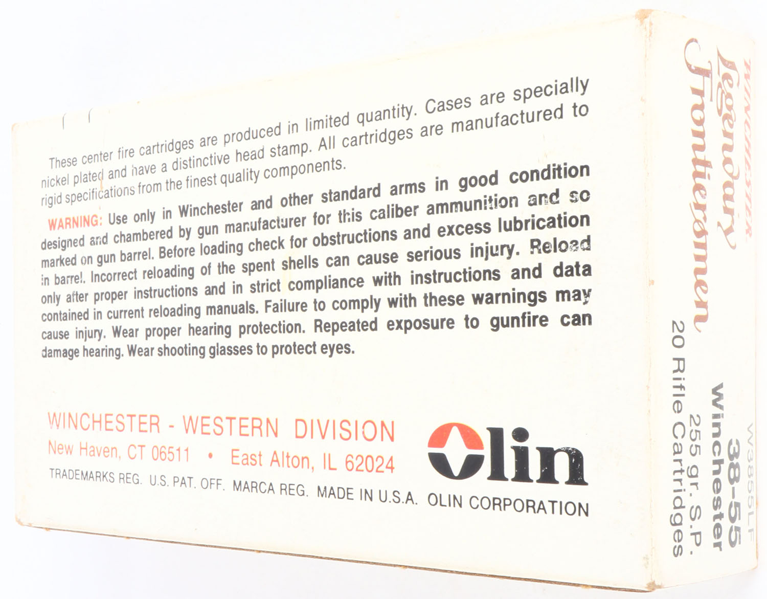 Winchester, Legendary Frontiersmen, .38-55 Winchester, 255 Grain Soft Point, Full, 1pc. Multi-colored box, box is solid with excellent color, very minor age soiling & corner wear, edges are crisp, end flaps are solid, ammo is excellent. Grade: Excellent ++ - Value: 30 to 90
