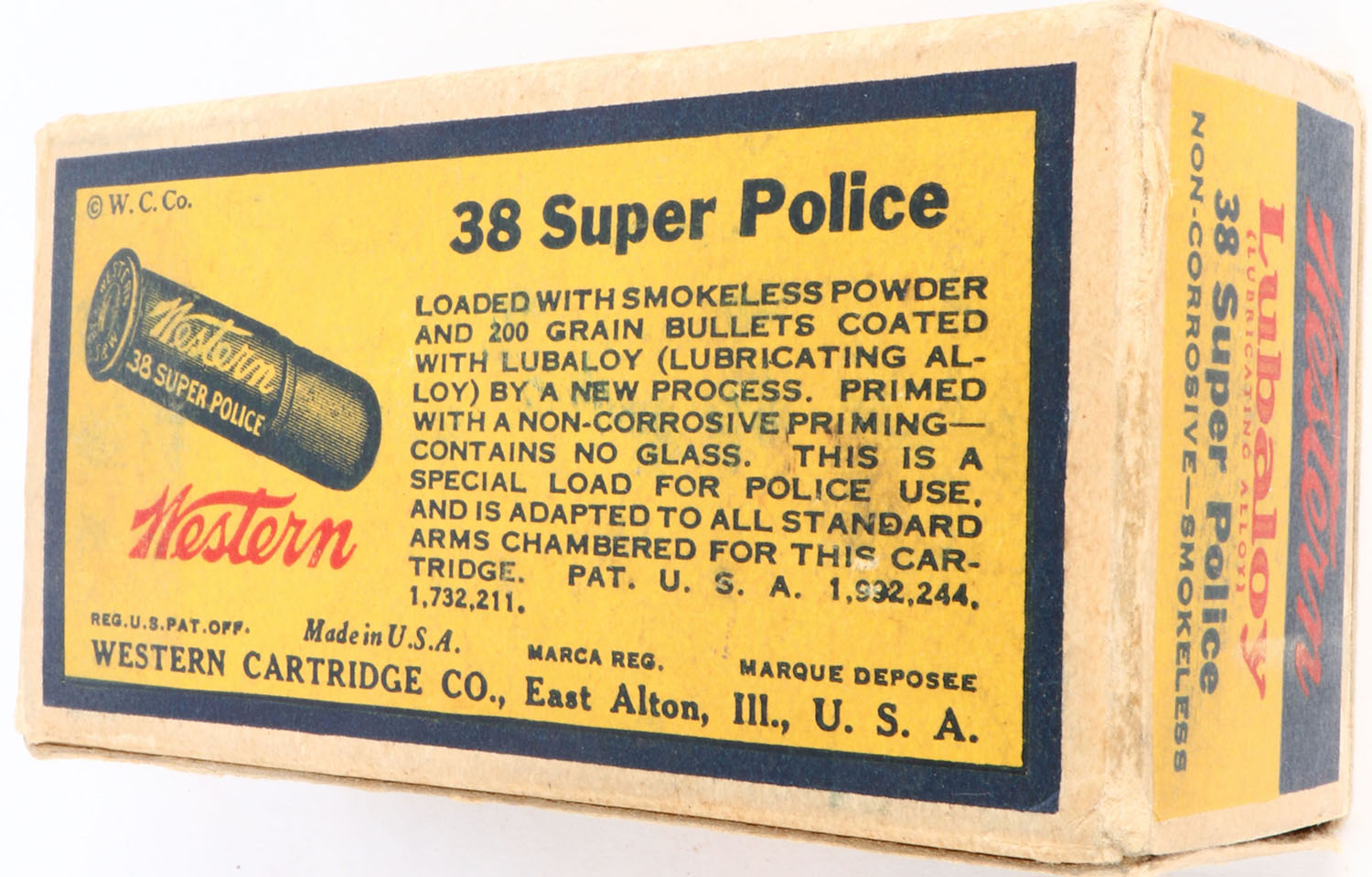 Western, Lubaloy, .38 Super Police, 200 Grain Coated Bullet, Partial 48rds. 1pc. Yellow blue & red bullseye box, left end flap is torn, partial seam split to back edge, box has very good to excellent color with some age soiling, minor shelf wear, some corner wear, minor edge wear, right end flap is solid, ammo is very good to excellent. Grade: Good ++ - Value: 20 to 60