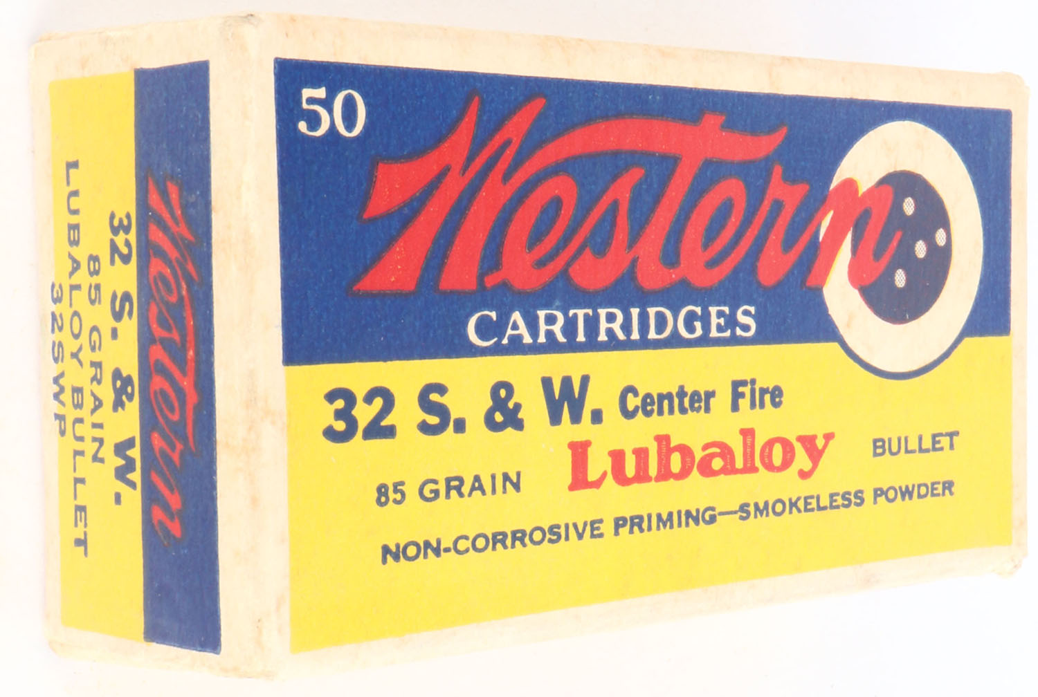 Western, Lubaloy, .32 Smith & Wesson, 85 Grain, Partial 49rds, 1pc. Yellow blue & red bullseye box, box is solid with minty color, minor corner wear, edges are mostly crisp, end flaps are solid, ammo is excellent. Grade: Excellent ++ - Value: 30 to 90