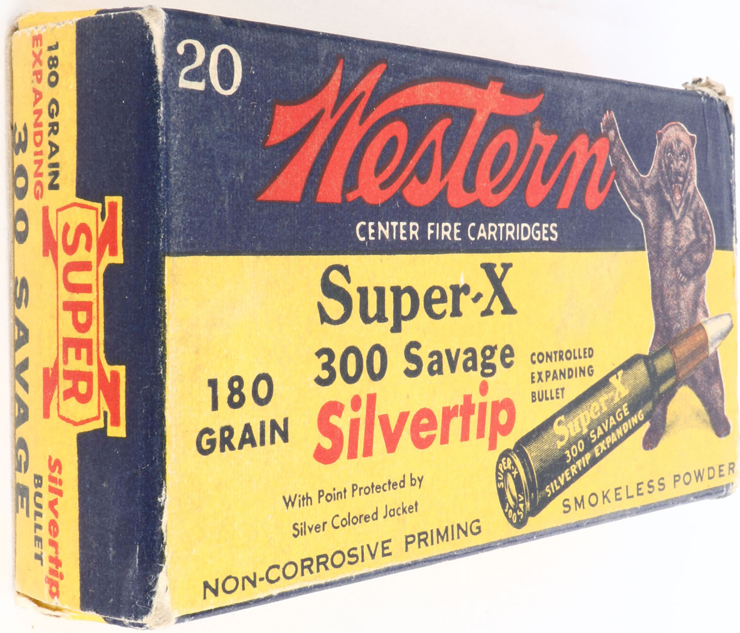Western, Super-X Silvertip, .300 Savage, 180 Grain Controlled Expanding Bullet, Full, 1pc. Yellow blue & red bear box, box is solid with excellent color, minor age soiling & shelf wear, some corner wear, very minor edge wear, end flaps are solid, ammo is excellent. Grade: Excellent - Value: 20 to 60