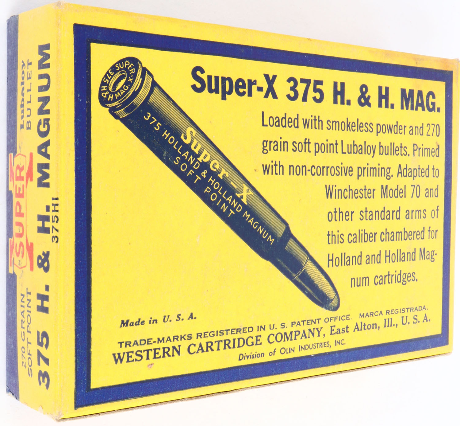 Western, Super-X, .375 H&H Magnum, 270 Grain Soft Point, Full, 1pc. Yellow blue & red box, box is solid with mint color, only very minor shelf & corner wear, edges are crisp, end flaps are solid, ammo is excellent. Grade: Excellent ++ - Value: 30 to 90