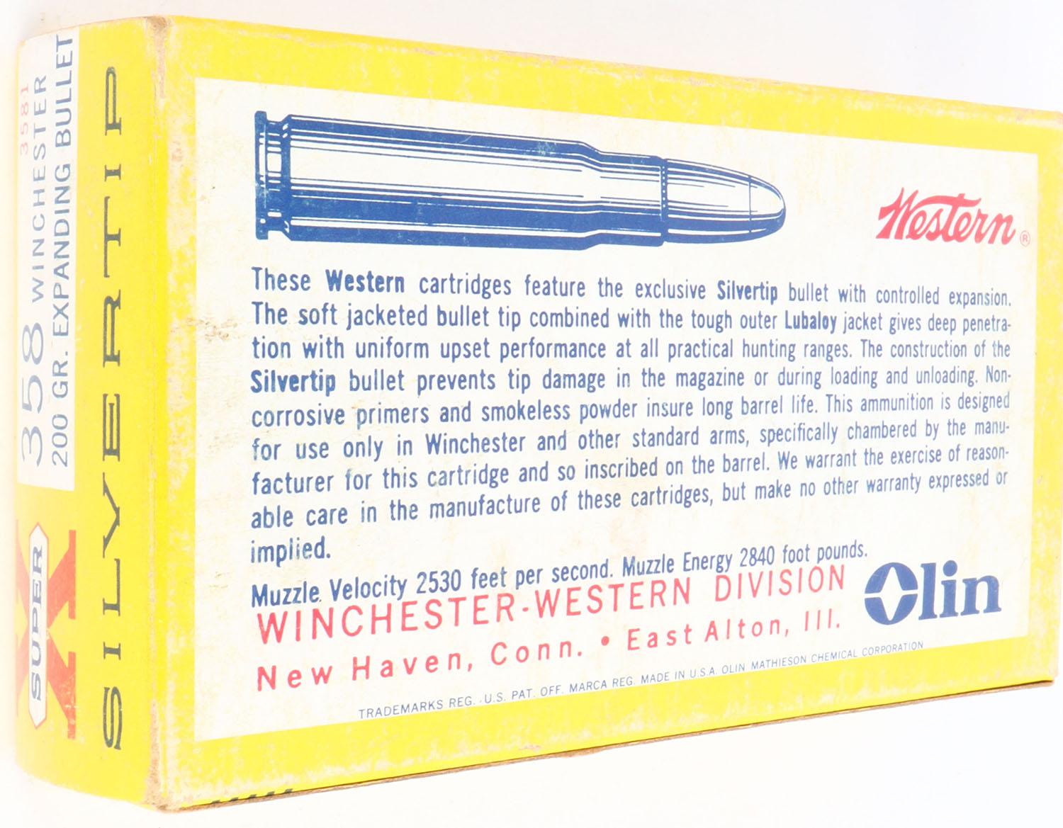 Western, Super-X Silvertip, .358 Winchester (8.8mm), 200 Grain Expanding Bullet, Full, 1pc. Yellow white & red box, box is solid with very good to excellent color, some shelf wear, top has been written on, minor corner wear, very minor edge wear, end flaps are solid, ammo is minty. Grade: Very Good ++ - Value: 20 to 60
