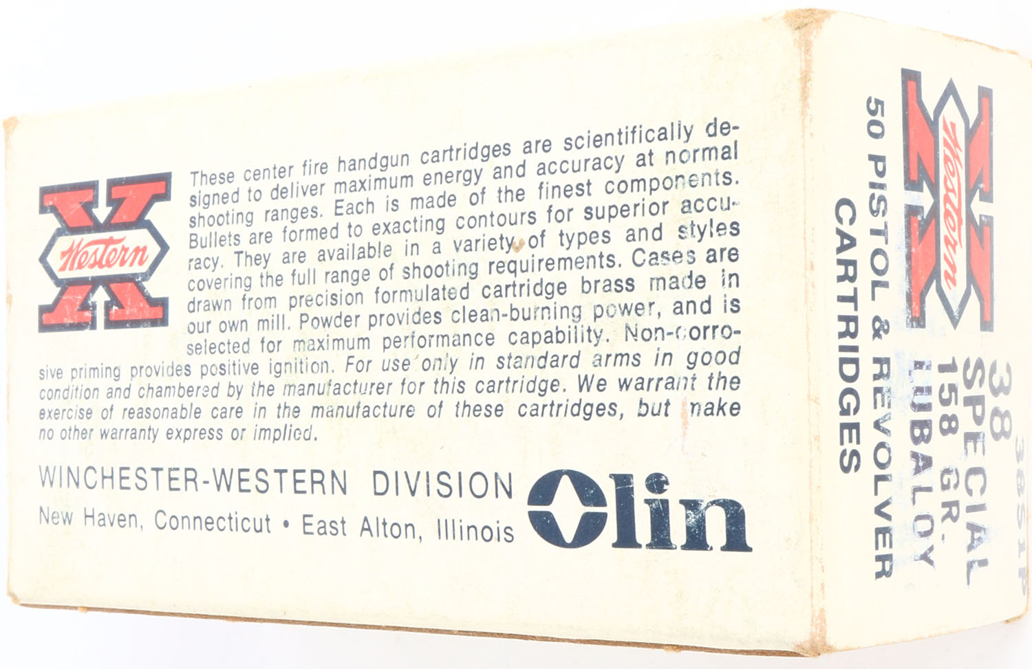 Western, X, .38 Special, 158 Grain Lubaloy, Full, 1pc. White & red box, box is solid with excellent color, very minor age soiling & shelf wear, minor corner wear, edges are mostly crisp, end flaps are solid, ammo is excellent. Grade: Excellent + - Value: 10 to 50