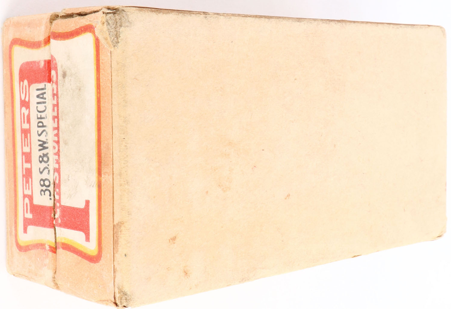 Peters, .38 Smith & Wesson Special, Smokeless, Full, 2pc. Buff box with white orange & red top & side sealing labels, box is solid with very good color, some age soiling, minor edge & corner wear, labels are intact, ammo is excellent. Grade: Excellent - Value: 30 to 90