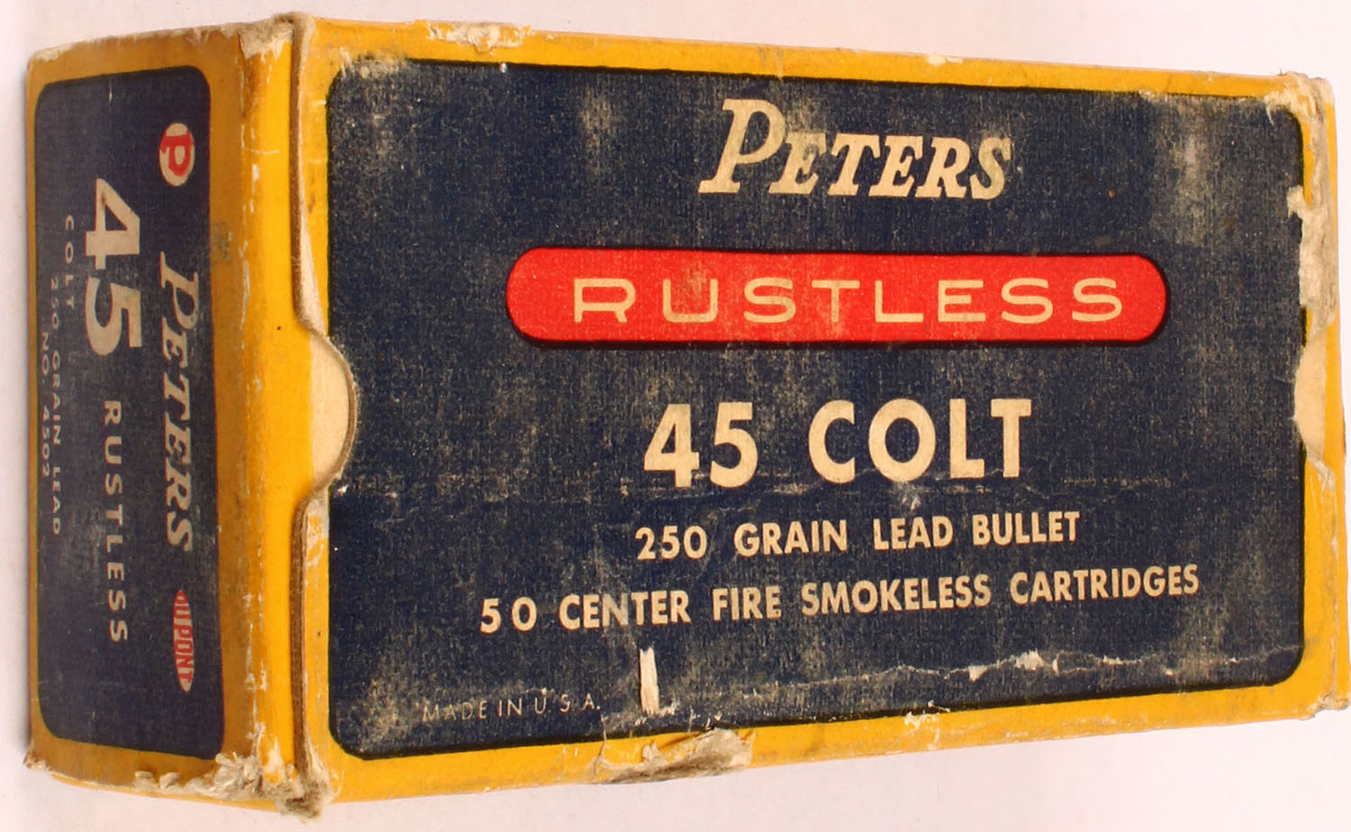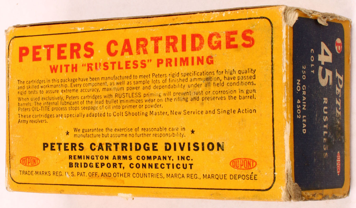 Peters, Rustless, .45 Colt, 250 Grain Lead, Partial 49rds., 1pc. Blue & yellow box, box is solid with good to very good color, some age soiling & color fading, some shelf wear, edge & corner wear, end flaps are solid, ammo is excellent. Grade: Very Good ++ - Value: 40 to 120