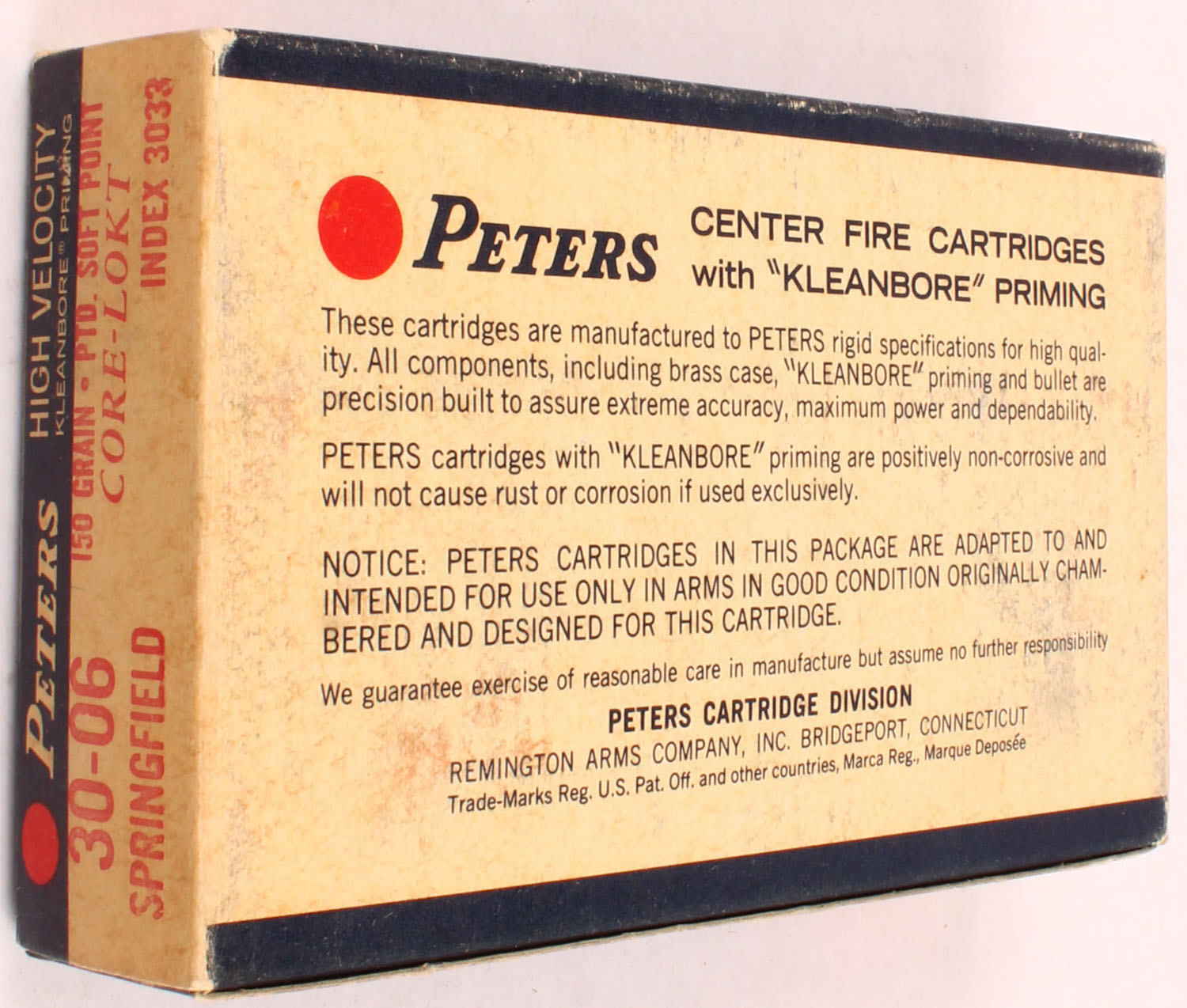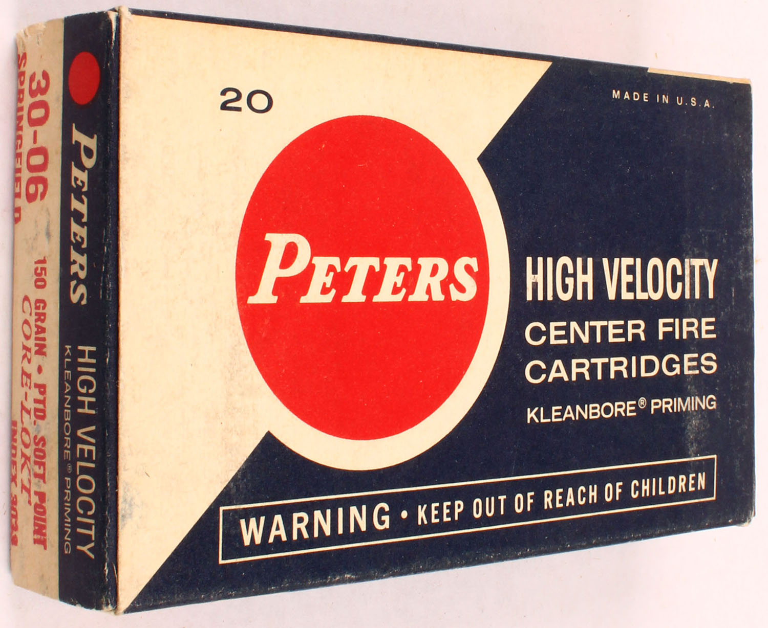 Peters, High Velocity, .30-06 Springfield, 150 Grain Pointed Soft Point Core-Lokt, Full, 1pc. Blue white & red box, box is solid with excellent color, minor age soiling & shelf wear, very minor corner wear, edges are mostly crisp, end flaps are solid, ammo is excellent. Grade: Excellent + - Value: 10 to 50
