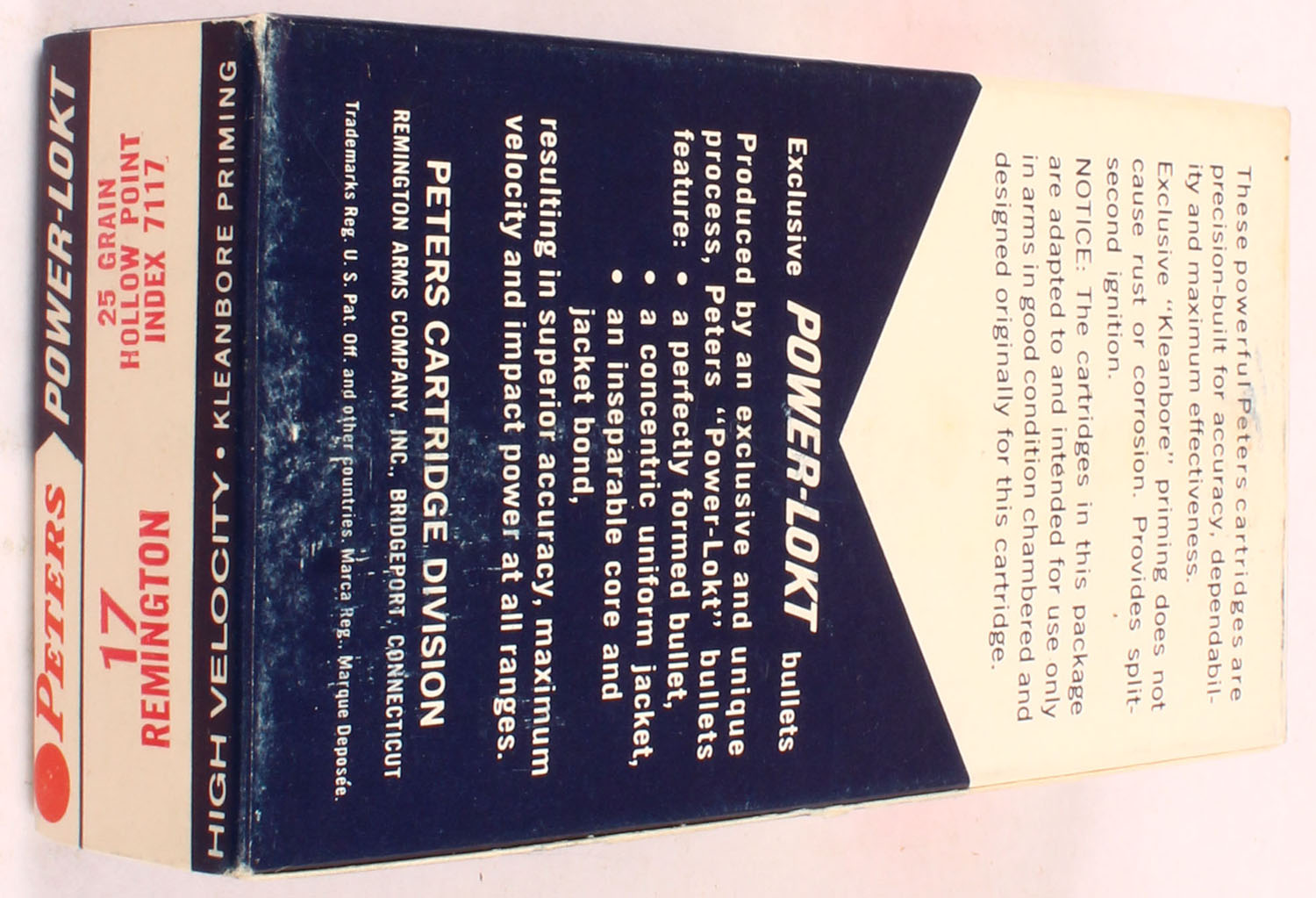Peters, Power-Lokt, .17 Remington, 25 Grain Hollow Point, Full, 1pc. Blue white & red box, box is solid with excellent color, corners are sharp, edges are mostly crisp, end flaps are solid, ammo is excellent. Grade: Excellent ++ - Value: 20 to 60
