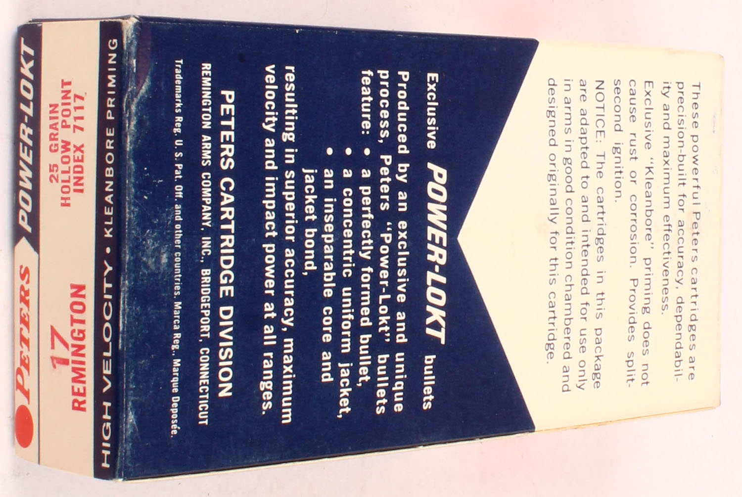 Peters, Power-Lokt, .17 Remington, 25 Grain Hollow Point, Full, 1pc. Blue white & red box, box is solid with excellent color, very minor shelf wear, corners are sharp, edges are mostly crisp, end flaps are solid, ammo is excellent. Grade: Excellent ++ - Value: 20 to 60