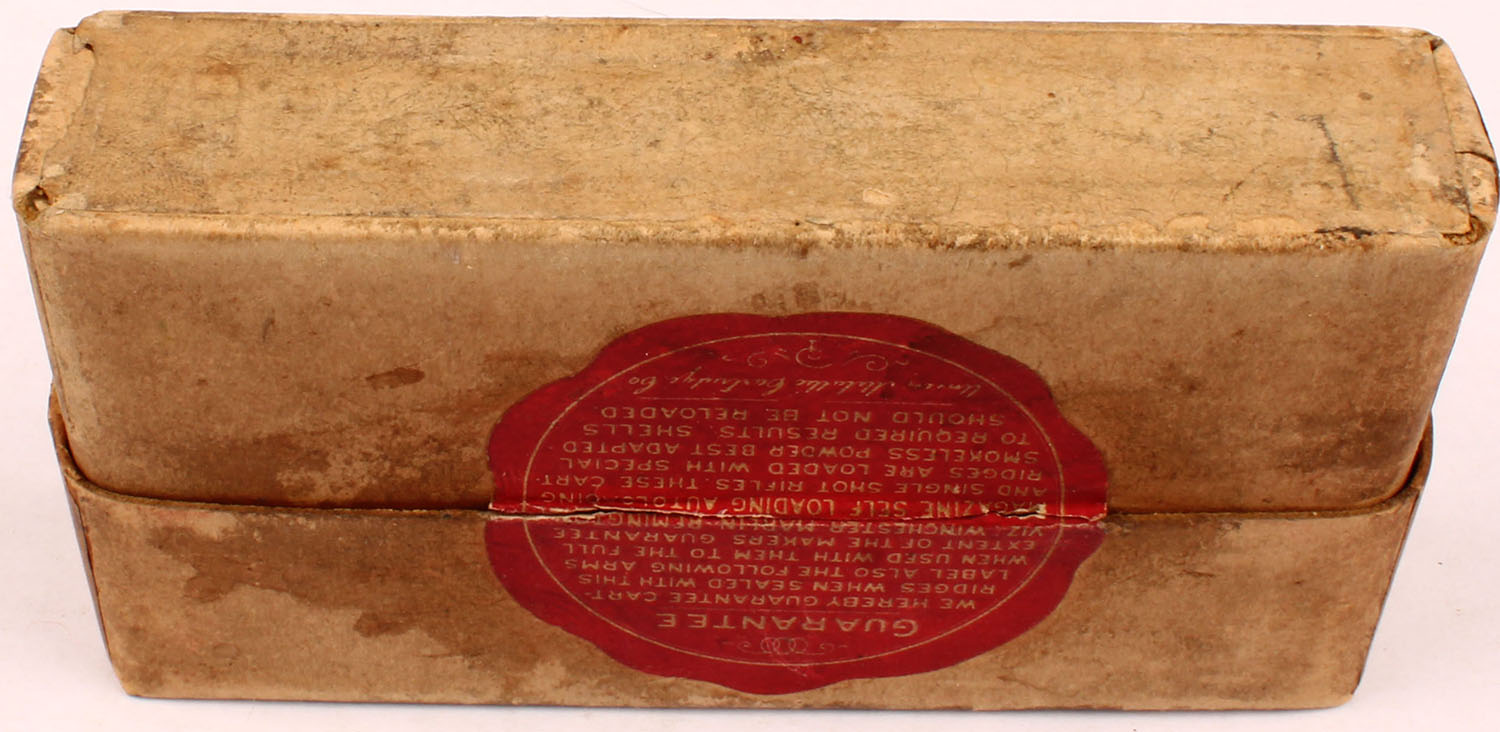 U.M.C., Central Fire Cartridges, .25-36 Marlin, 117 Grain Metal Cased Bullet, Smokeless, Full, 2pc. Buff box with buff label, box is solid with very good color, some age soiling & shelf wear, water stain on front, front has been stamped by a cartridge collectors organization, minor corner wear, edges are mostly crisp, label is intact, ammo is excellent. Grade: Very Good ++ - Value: 40 to 120