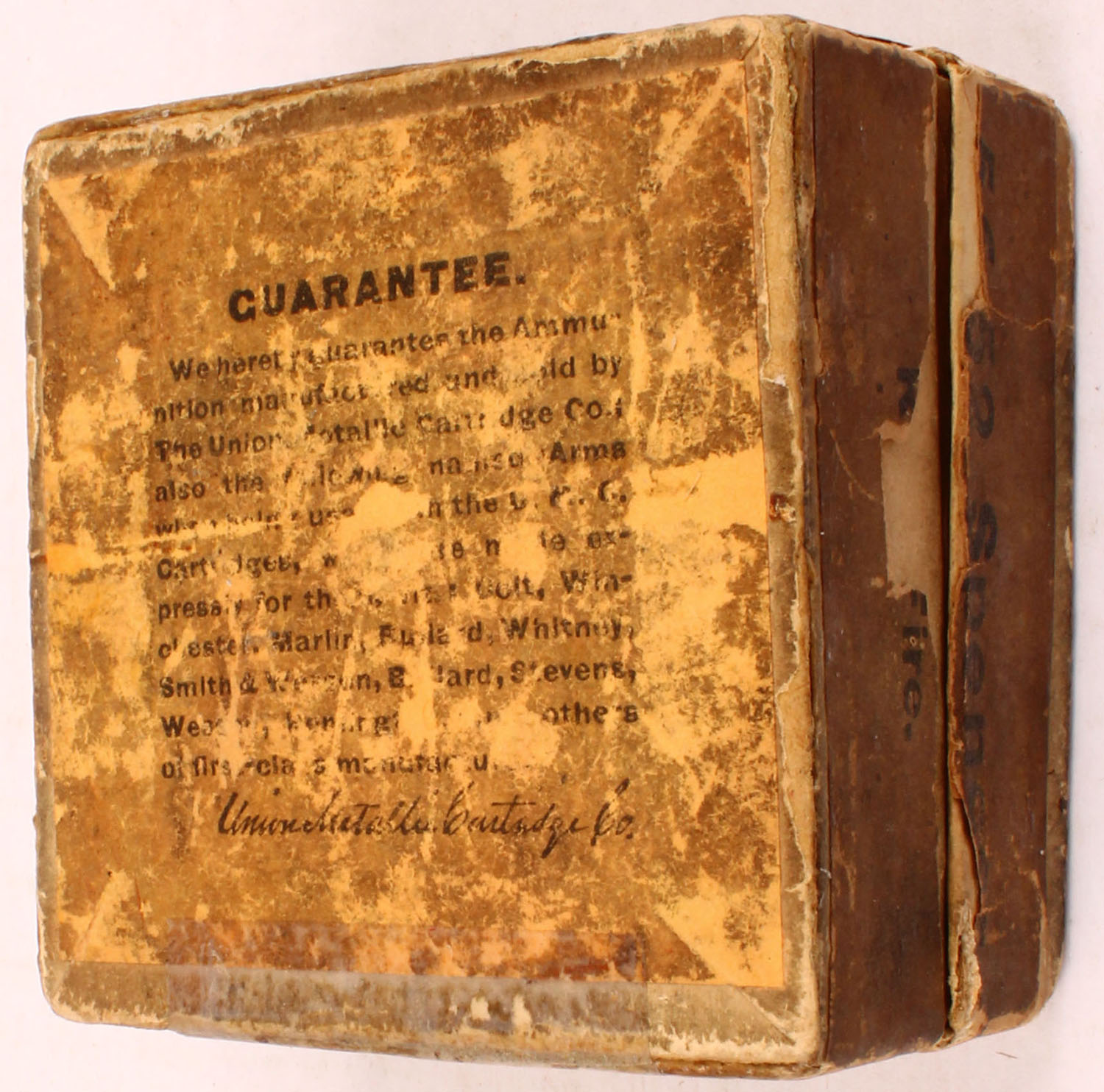 U.M.C., Rim-Fire Cartridges, .56-52 Spencer, Partial 7rds., 2pc. Buff box with buff top & side sealing labels, box is solid with fair color, age soiling, shelf wear, edge & corner wear, side sealing label is 60% intact, ammo is excellent. Grade: Good ++ - Value: 30 to 120