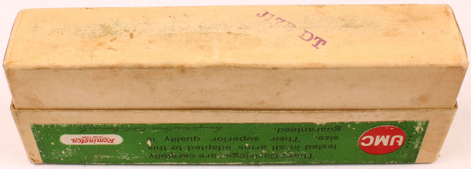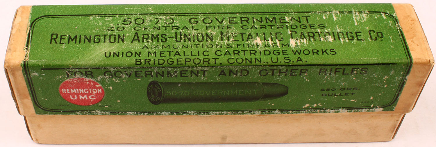 REM-UMC, .50-70 Government, 450 Grain Bullet, Full, 2pc. Buff box with green label, box is solid with excellent color, some shelf wear, very minor corner wear, edges are crisp, label is intact, ammo is very good. Grade: Excellent + - Value: 50 to 150