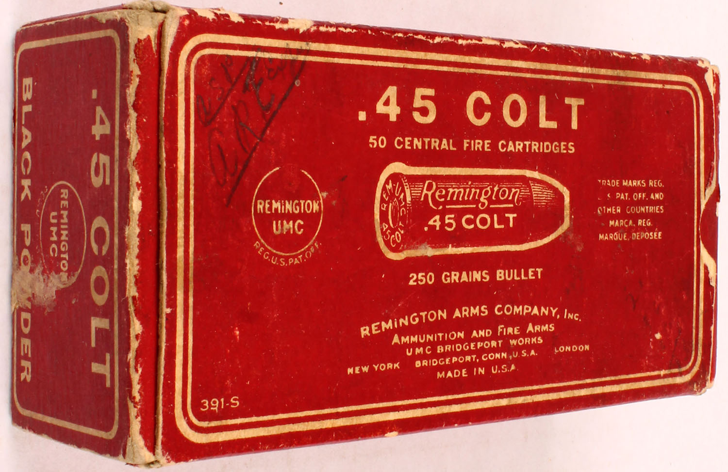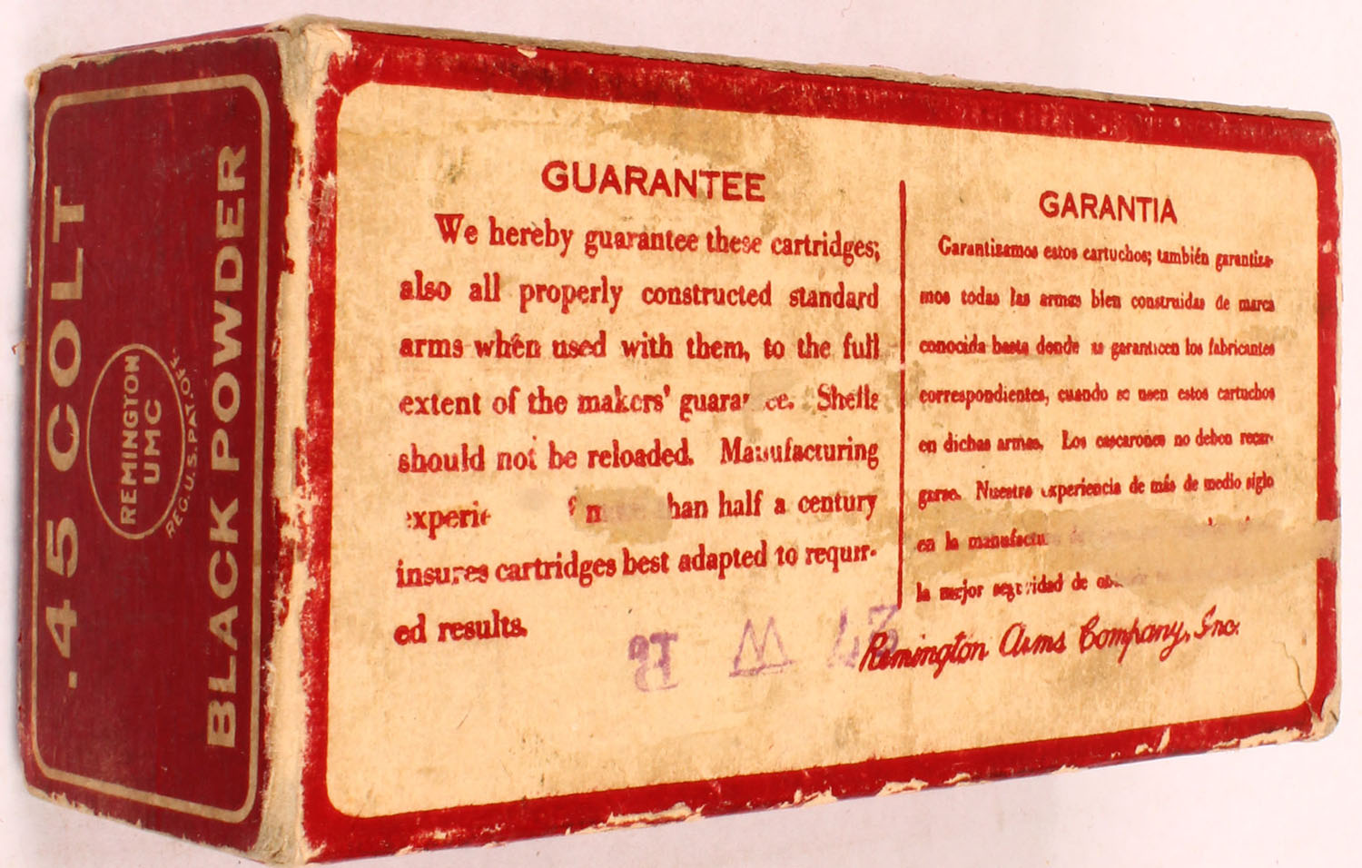 REM-UMC, .45 Colt, 250 Grain Bullet, Black Powder, Full of incorrect ammo (W.R.A.Co. H/S), 1pc. Red & white box, box is solid with very good color, some age soiling, minor shelf wear, some corner wear, very minor edge wear, end flaps are solid, top has been written on, ammo is very good to excellent. Grade: Very Good ++ - Value: 30 to 90