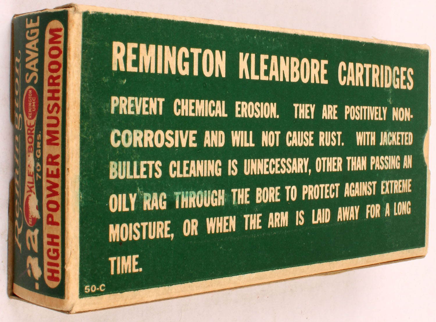 Remington, .22 Savage High Power, 70 Grain Mushroom Bullet, Full, 1pc. Green white & red dogbone box, box is solid with excellent color, very minor age soiling, corners are mostly sharp, edges are crisp, end flaps are solid, front has been written on, ammo is excellent. Grade: Excellent + - Value: 40 to 120