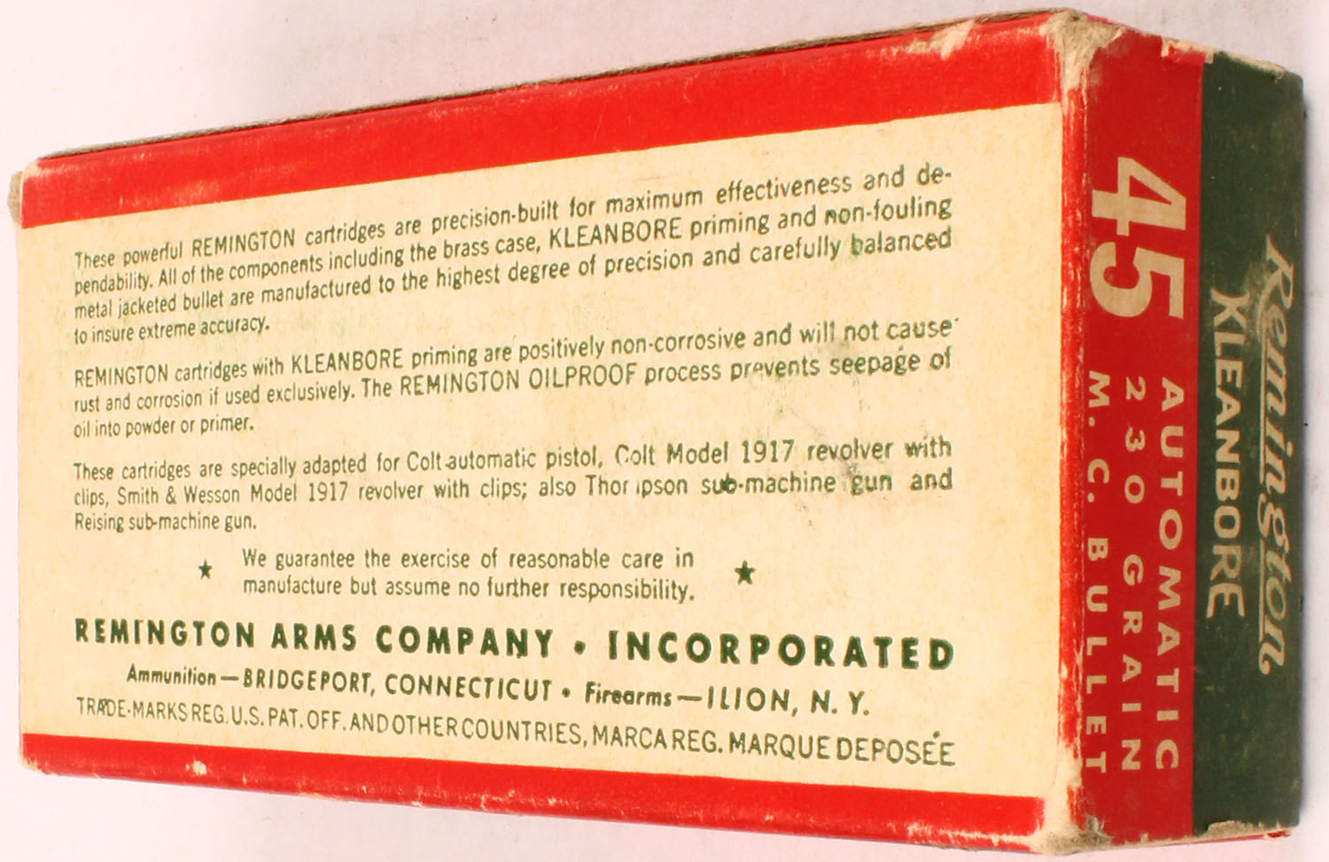 Remington, Kleanbore, .45 Automatic, 230 Grain Metal Case Bullet, Full of incorrect ammo, 1pc. Green red & white box, box is solid with excellent color, some shelf & corner wear, very minor edge wear, staining to front, end flaps are solid, ammo is excellent. Grade: Excellent - Value: 8 to 40