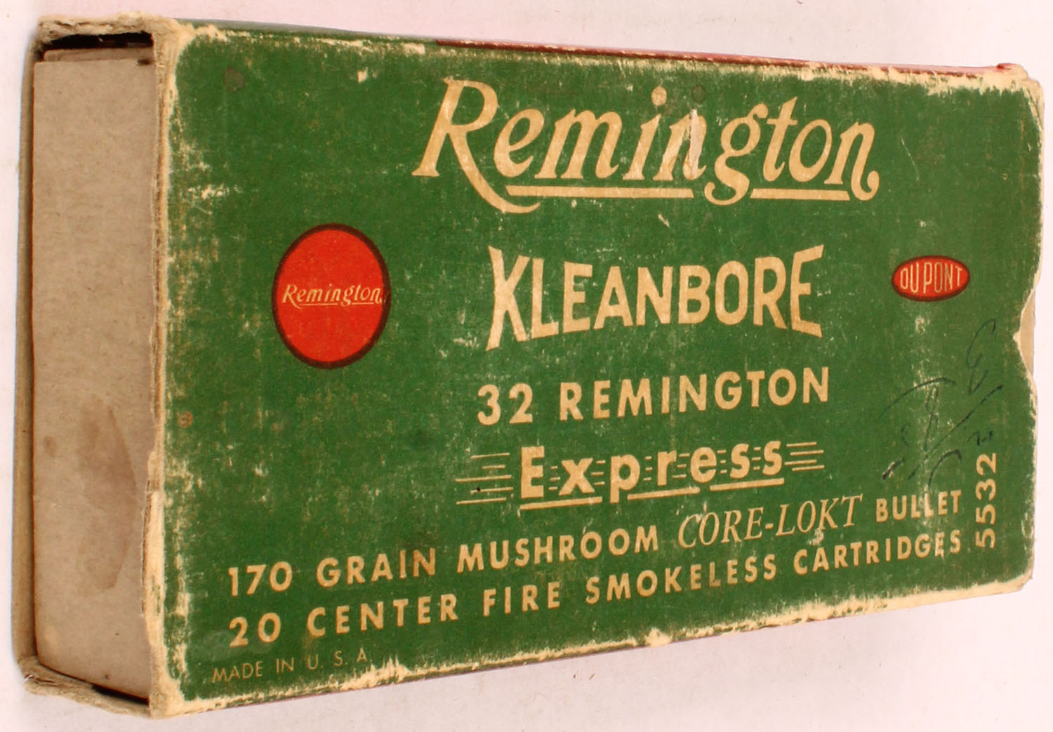 Remington, Kleanbore Express, .32 Remington, 170 Grain Mushroom Core-Lokt Bullet, Full, 1pc. Green red & white box, box is missing both end flaps, very good color, some age soiling & shelf wear, edge & corner wear, top has been written on, ammo is excellent. Grade: Good ++ - Value: 8 to 40
