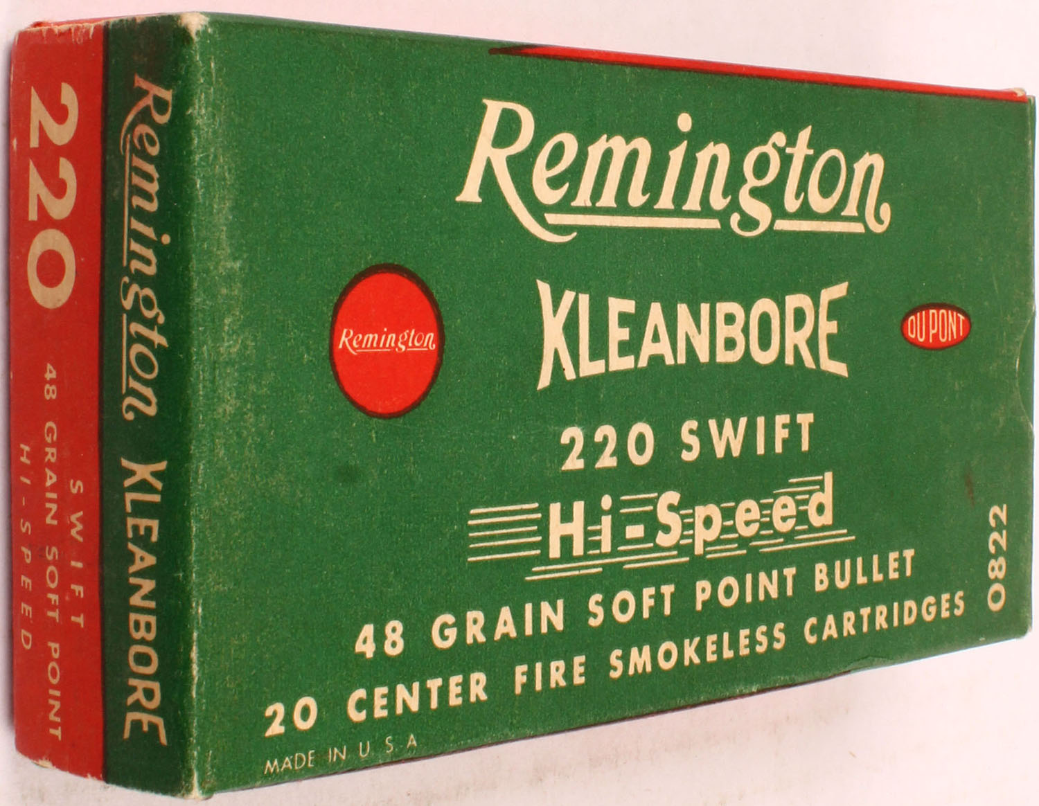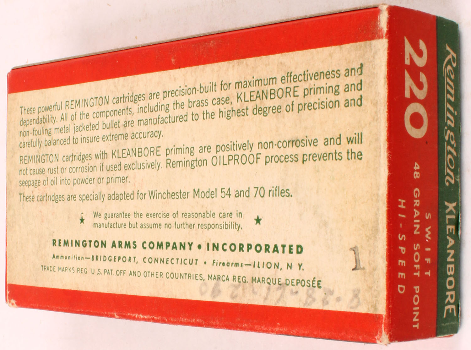 Remington, Kleanbore, .220 Swift Hi-Speed, 48 Gr. Soft Point bullet, 1pc, Full, Green/red box with white print, box is solid with very minor age soiling on bottom, light pencil marks on bottom, & light rub marks in spots, ammo is excellent. Grade: Excellent - Value: 40 to 80