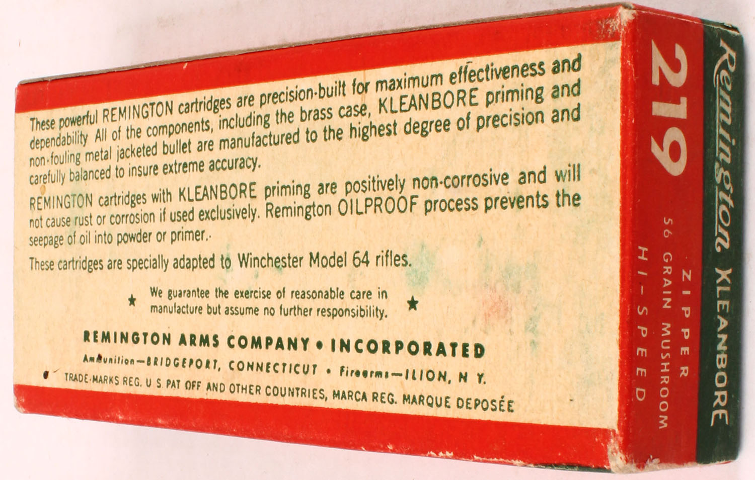 Remington, Kleanbore, .219 Zipper Hi-Speed, 56 Gr. mushroom bullet, 1pc, Full, Green/red box with white print, box is solid with rub marks, ammo is excellent. Grade: Excellent + - Value: 100 to 300