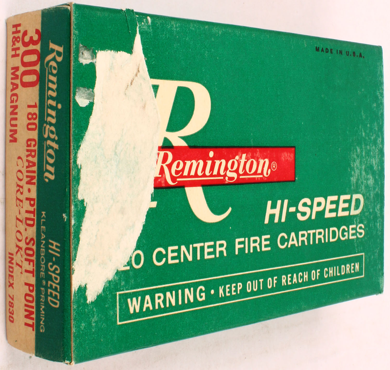 Remington, .300 H&H Mag Hi-Speed, 180 Gr. Pointed Soft point Core-Lokt Bullet, 1pc, Full, Green/white box with red/white print, box is solid with rub marks, & sticker tear spot, ammo is excellent. Grade: Very Good ++ - Value: 40 to 80