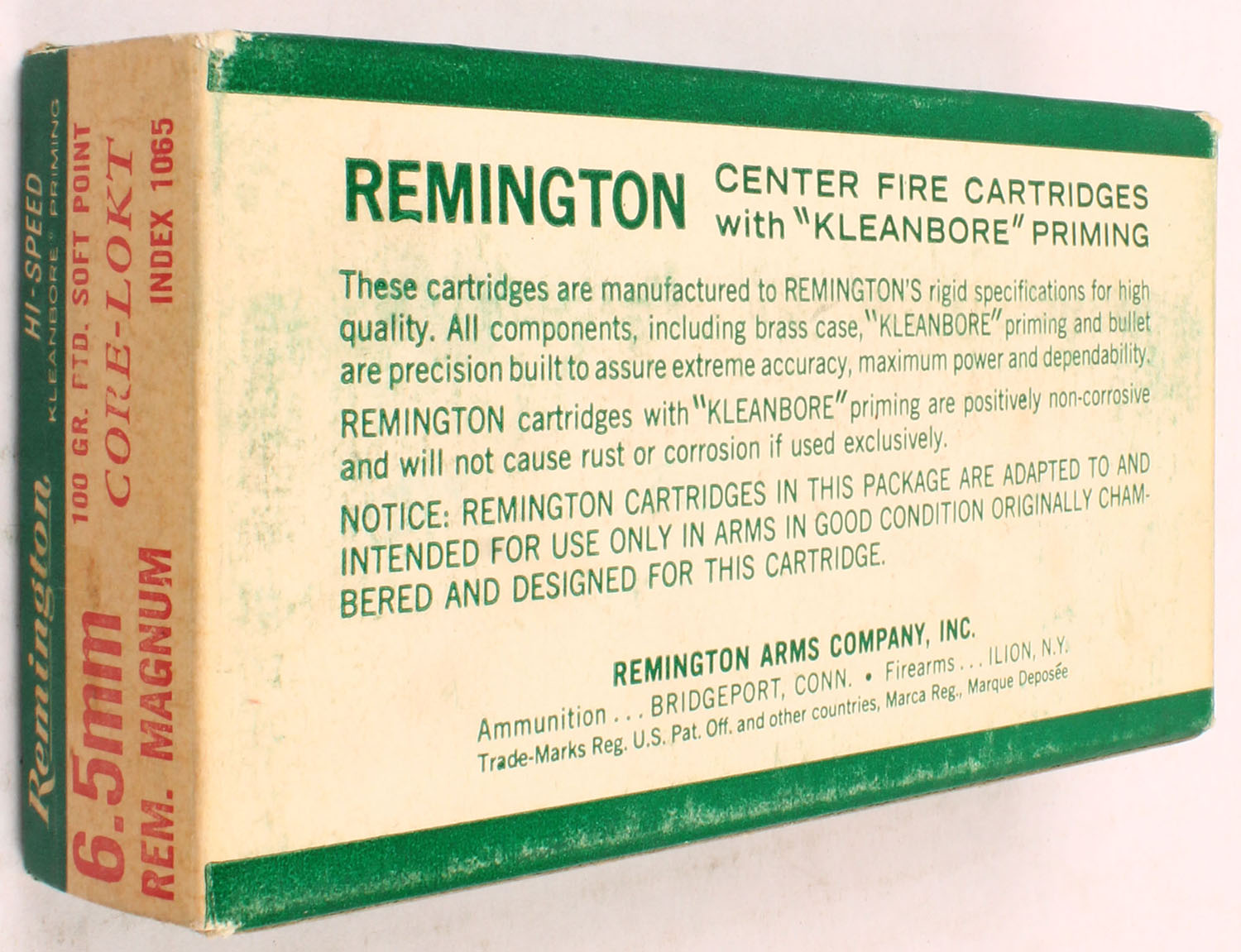 Remington, 6.5 Rem. Magnum Hi-Speed, 100 Gr. Pointed Soft point Core-Lokt Bullet, 1pc, Full, Green/white box with red/white print, box is solid with rub marks, label tears marks, & tape, ammo is excellent. Grade: Very Good + - Value: 30 to 60