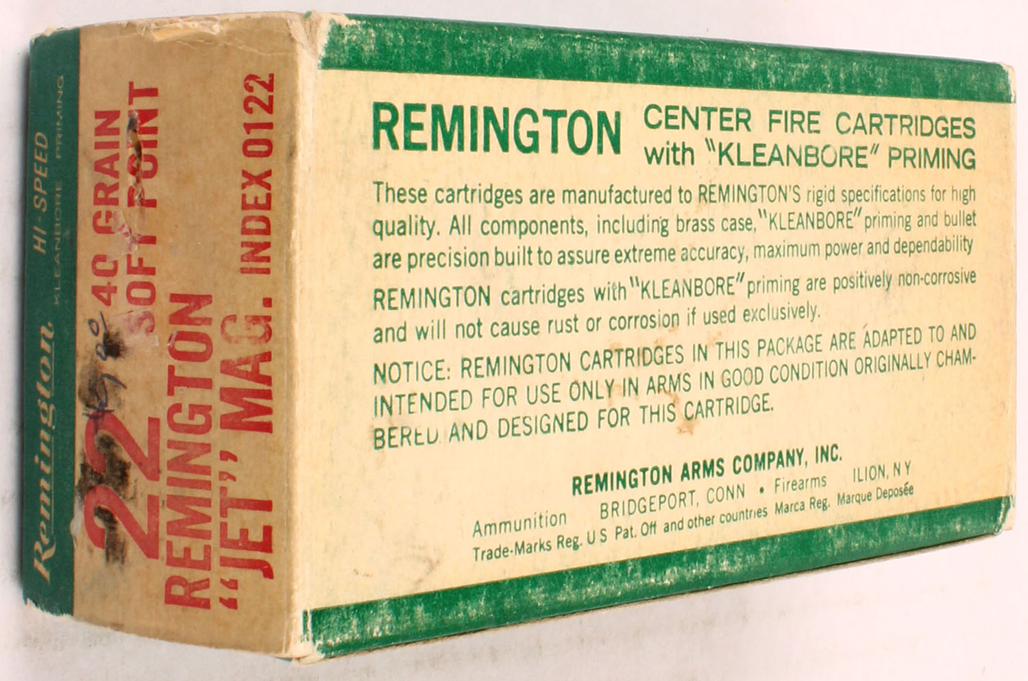 Remington, .22 Rem Jet Mag Hi-Speed, 40 Gr. Soft point Bullet, 1pc, Full, Green/white box with red/white print, box is solid with rub marks, pen marks, tape marks, ammo is excellent. Grade: Very Good ++ - Value: 60 to 120