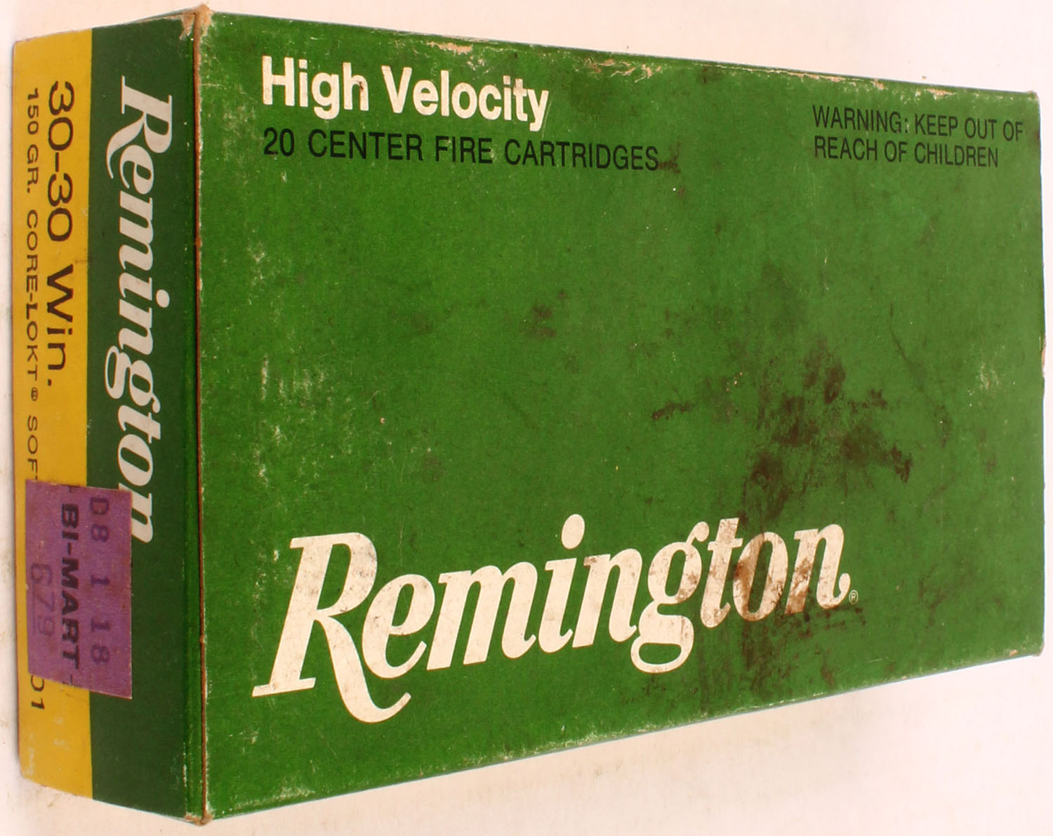 Remington, High Velocity, .30-30 Win., 150 Gr. Soft Point Core-Lokt, 1pc, Full, green/yellow box with white/black print, box is solid with rub marks, & stains, ammo is Excellent. Grade: Very Good + - Value: 30 to 60