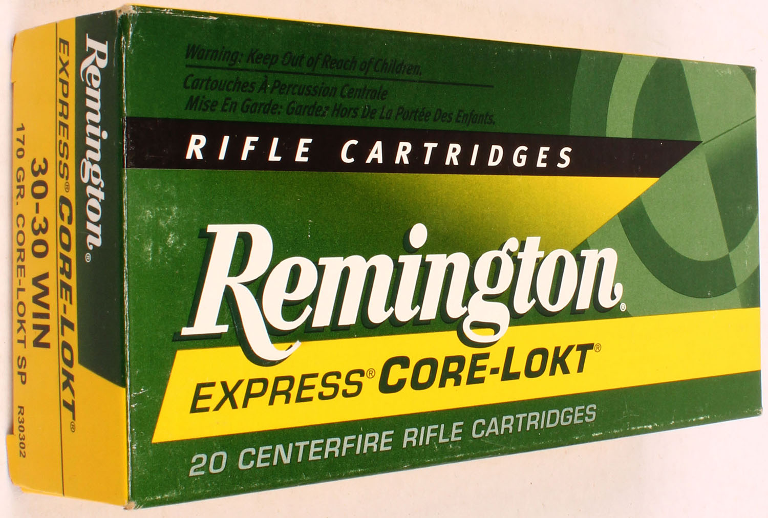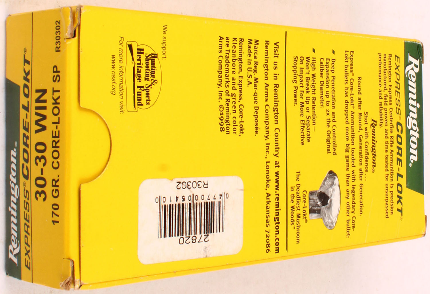 Remington, Express Core-Lokt, .30-30 Win, 170 Gr. Core-Lokt SP Bullet, green/yellow box with white/black/green print, box is solid with light wear, ammo is excellent. Grade: Excellent - Value: 30 to 60