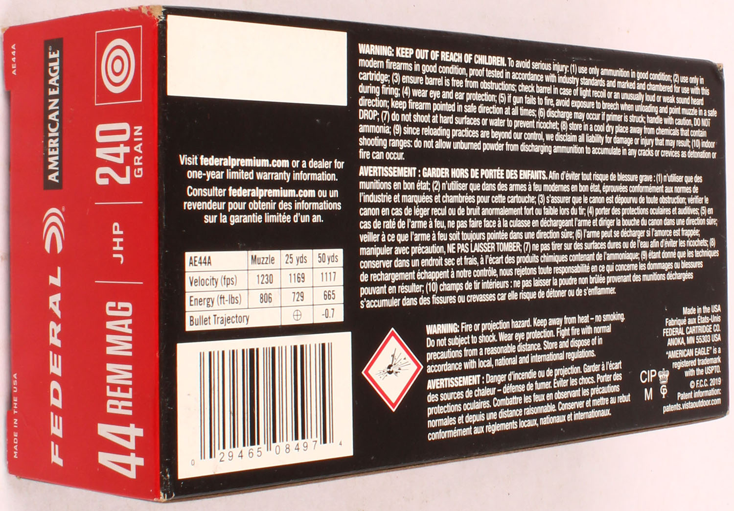 Federal, American Eagle, .44 Rem Mag., 240 Gr. JHP, 1pc, Full, red/black box with white print, box is solid with little wear, ammo is excellent. Grade: Excellent ++ - Value: 50 to 100