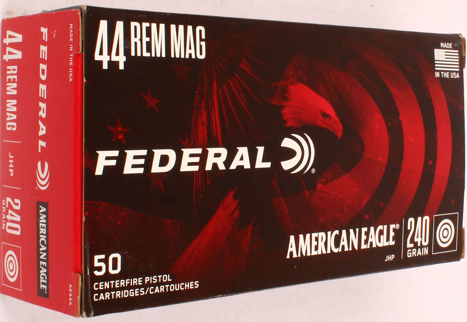 Federal, American Eagle, .44 Rem Mag., 240 Gr. JHP, 1pc, Full, red/black box with white print, box is solid with little wear, ammo is excellent. Grade: Excellent ++ - Value: 50 to 100
