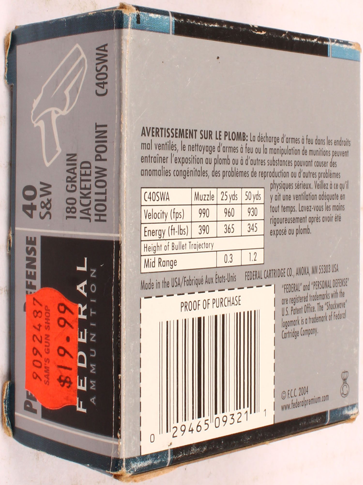 Federal, Personal Defense, 40 S&W, 180 Grain JHP, Full, 1pc. multi-colored box, box is solid with excellent color, Ammo is excellent. Grade: Excellent - Value: 20 to 60
